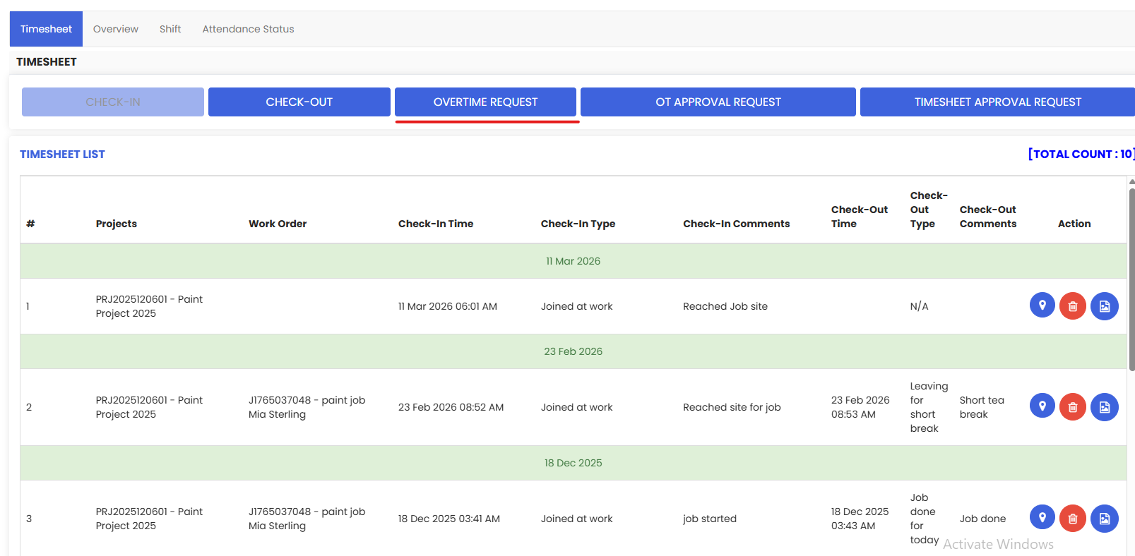 In DreamzFSM, the Timesheet section goes beyond simple check-in and check-out. It provides managers and administrators with powerful tools to manage overtime requests, approve timesheets, track employee attendance in real time, map staff shifts, and view detailed attendance analytics — all from a single, unified interface.