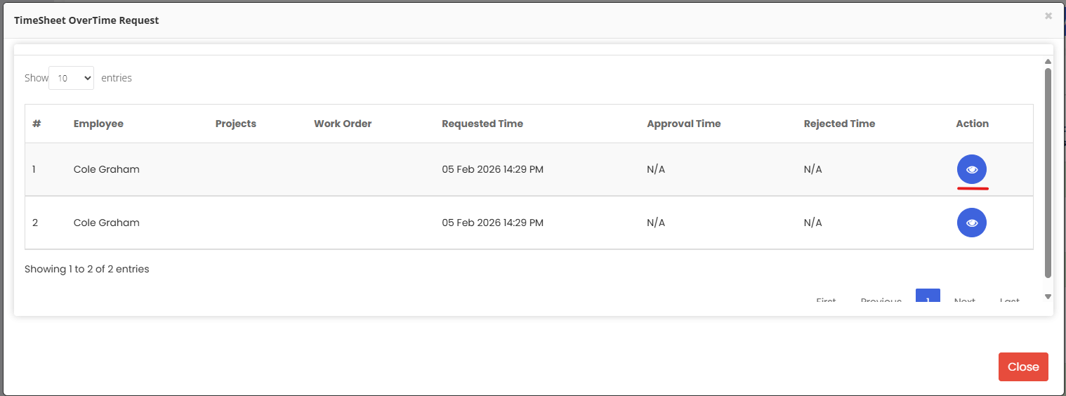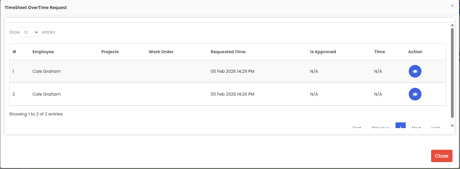 Go to Jobs → Timesheet and click the Overtime Request button. In the Timesheet Overtime Request list, click the view icon next to the relevant entry to review and approve the request.