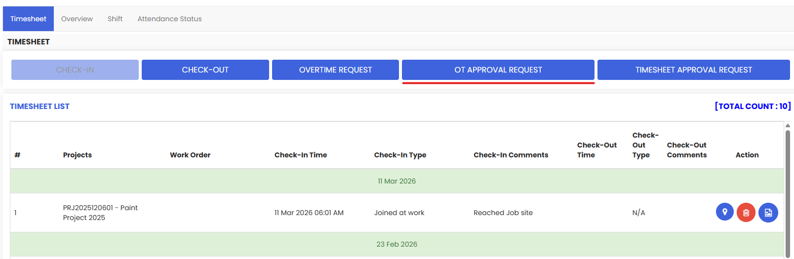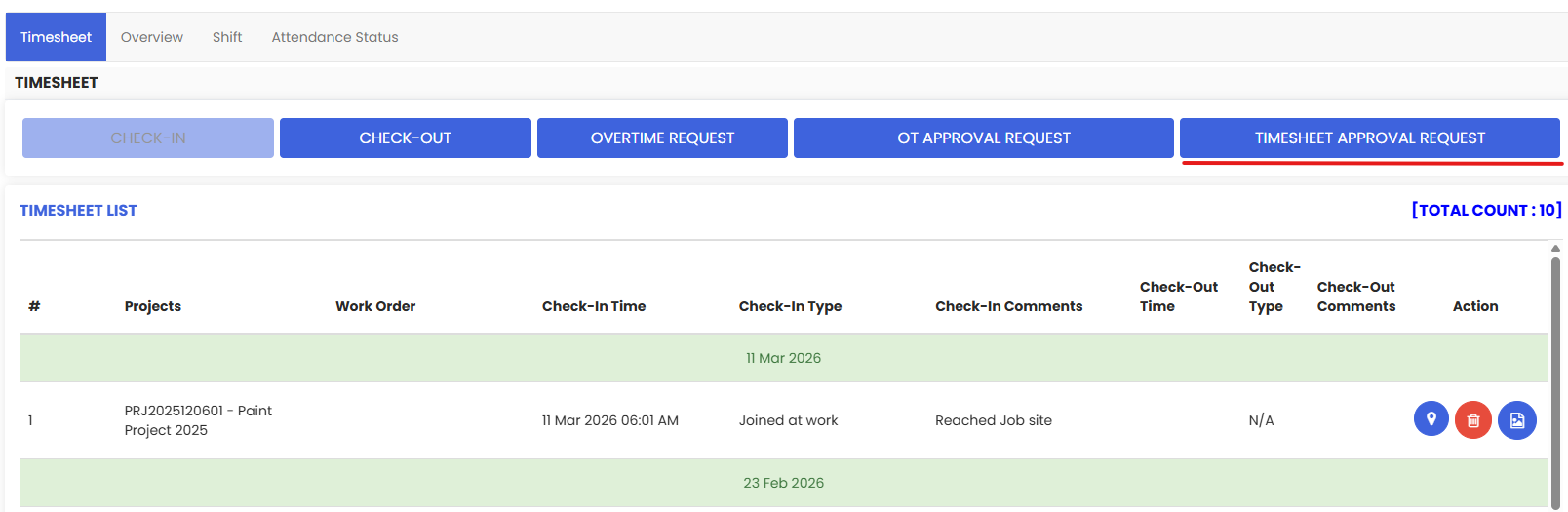 Click the Timesheet Approval Request button to view the Timesheet Approval list. This allows managers to review and approve submitted timesheets from their team members, ensuring all working hours are verified before being finalised.