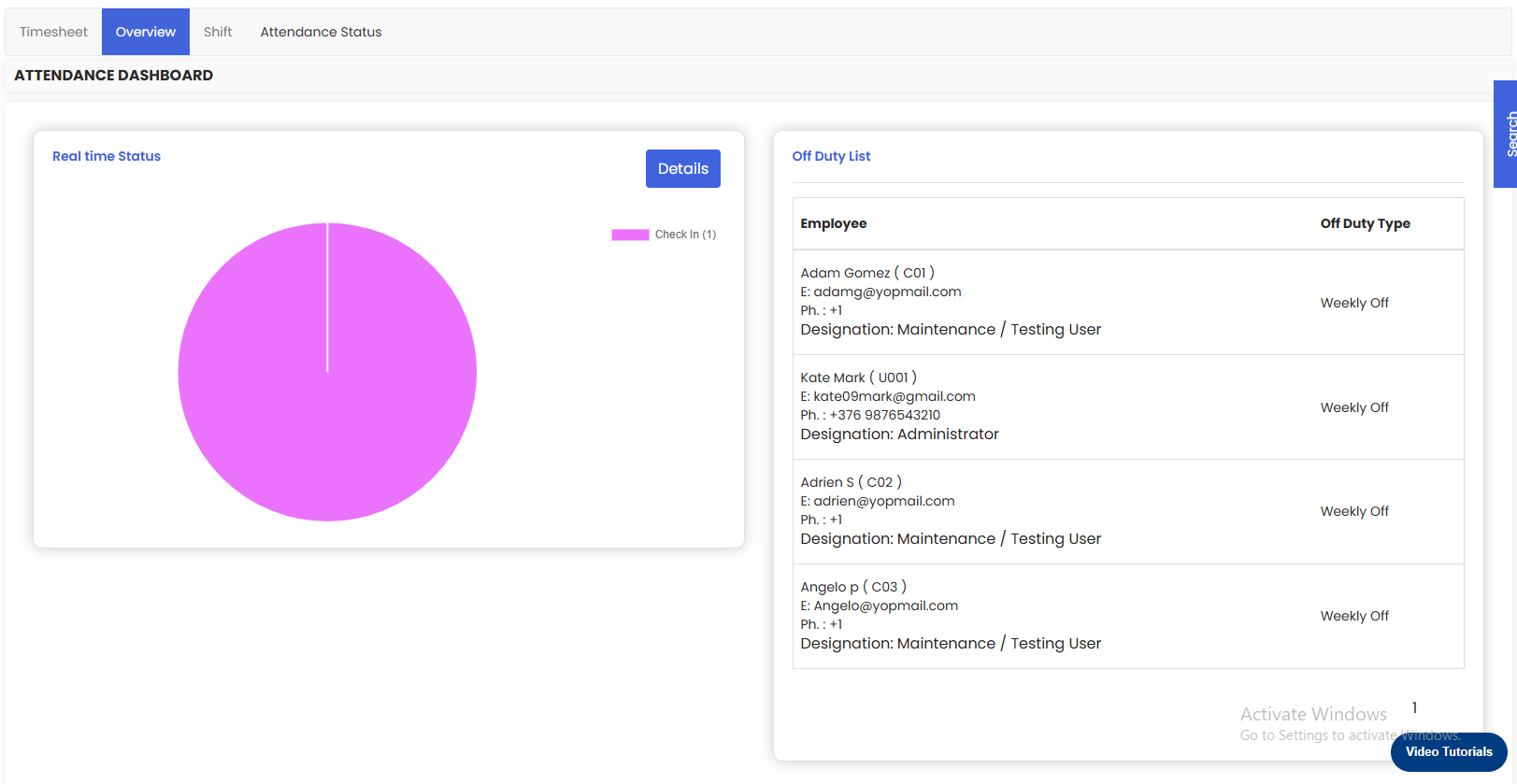 - Real Time Status – A live pie chart showing how many employees are currently checked in.