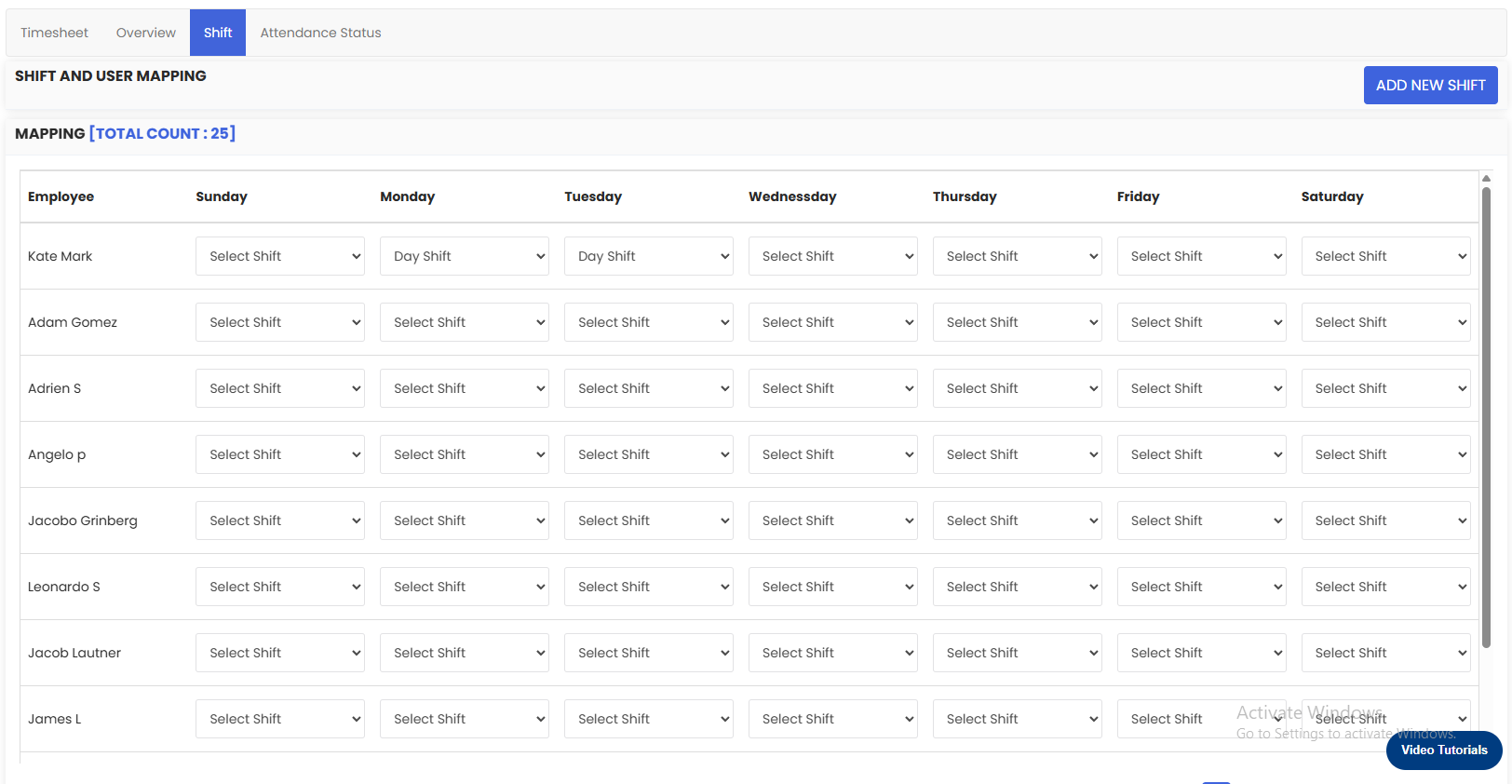 Click the Shift tab on the Timesheet page to open the Shift and User Mapping screen. Use the dropdown menus to assign a shift to each employee for each day of the week. Click Add New Shift to create additional shift types if needed.