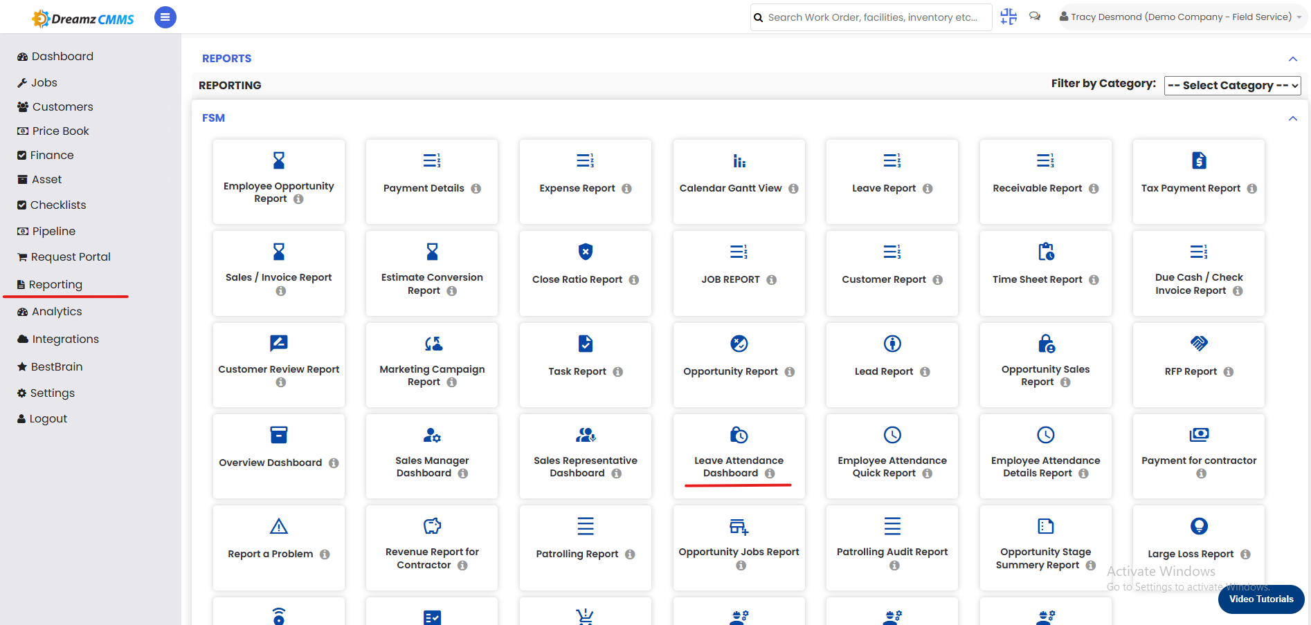 From the left-side menu, click on Reporting. On the Reports page, locate and click on Leave Attendance Dashboard under the FSM category.