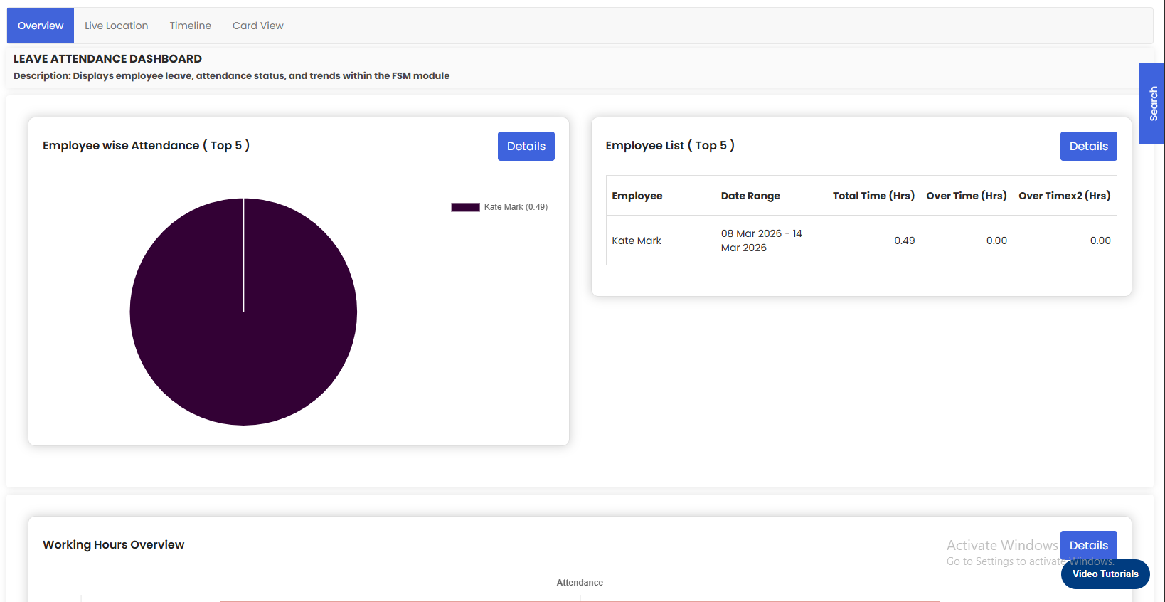 From Jobs → Timesheet, managers can review and approve Overtime Requests and OT Approval Requests, as well as manage Timesheet Approval Requests. The Overview tab provides a real-time attendance dashboard with live status, off-duty lists, and attendance summaries. The Shift tab allows shift mapping for all employees across every day of the week. The Attendance Status tab gives a date-by-date attendance view that can be exported to Excel. For deeper analytics, the Leave Attendance Dashboard under Reporting shows attendance trends, working hours, leave summaries, and weekly off schedules. The Live Location, Timeline, and Card View tabs provide real-time field visibility into where employees are and what they are working on.