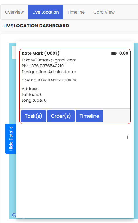 From the Leave Attendance Dashboard, click the Live Location tab to open the Live Location Dashboard. This displays a real-time map view showing the current location of each employee. Click on an employee card to view their details, including their last check-out time, address, and GPS coordinates. From the employee card, you can also click Task(s), Order(s), or Timeline to see what they are currently working on.