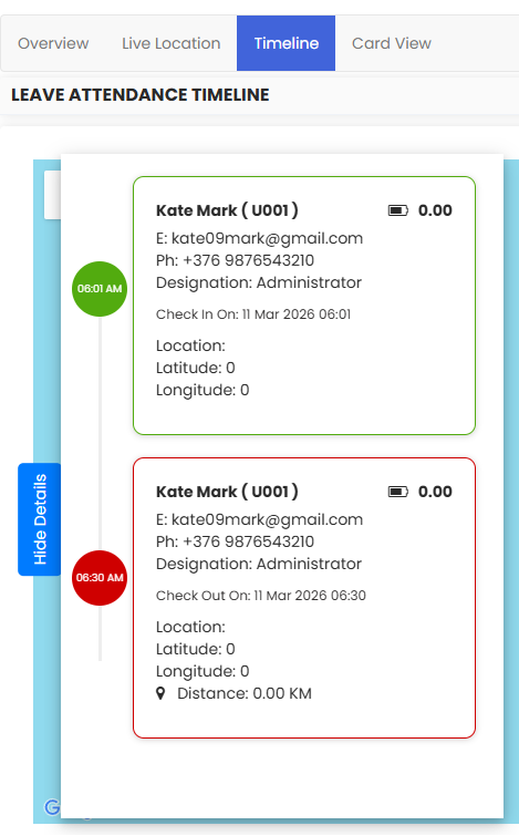 Click the Timeline tab to open the Leave Attendance Timeline. This view presents a chronological timeline of each employee's check-in and check-out events for the day, displayed as colour-coded cards — green for check-in and red for check-out — with timestamps, location coordinates, and distance travelled.
