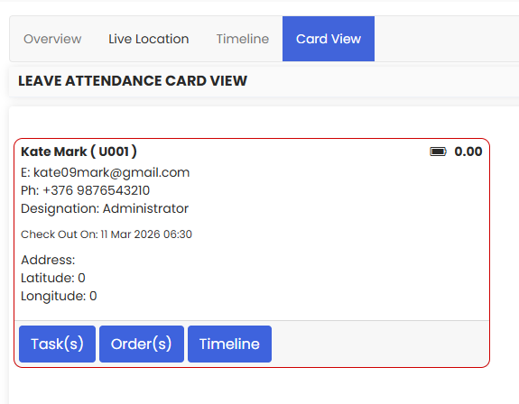 Click the Card View tab to open the Leave Attendance Card View. This displays each employee as an individual card showing their contact details, designation, last check-out time, and location coordinates. From each card, you can quickly access the employee's Task(s), Order(s), and Timeline.