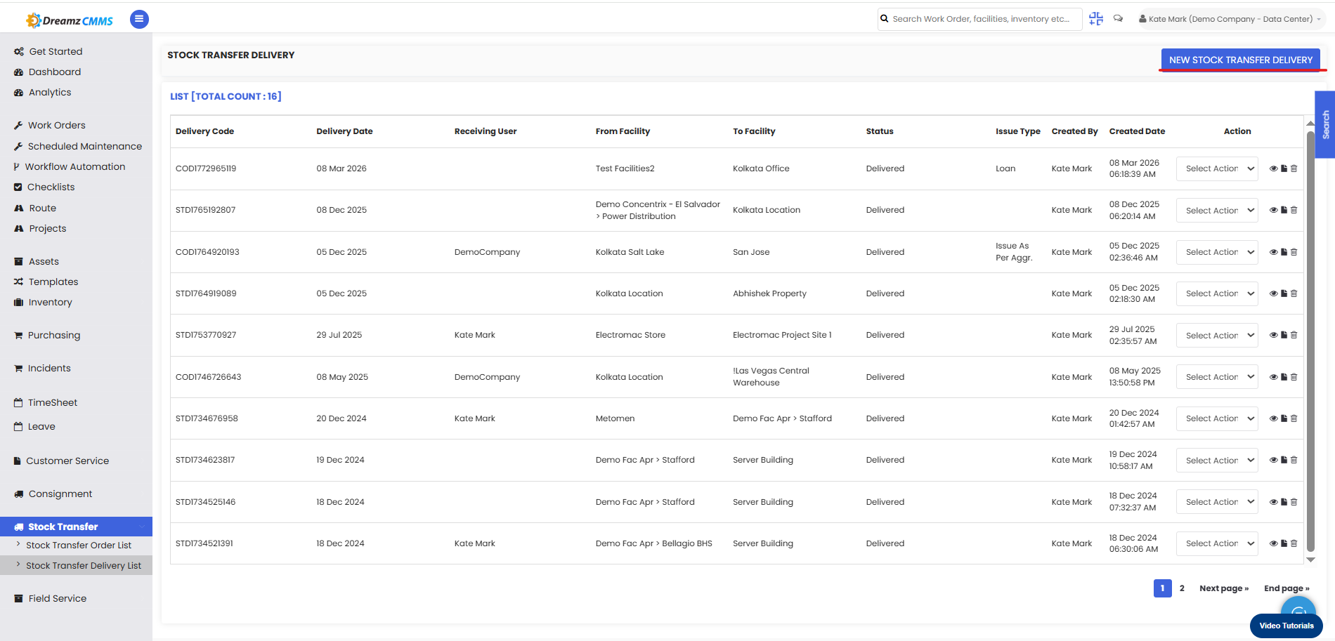 Stock Transfer Delivery List in DreamzCMMS