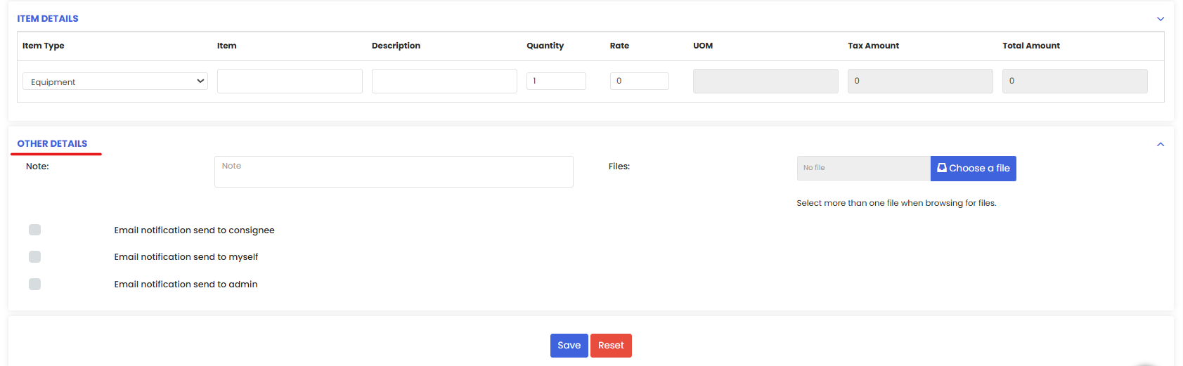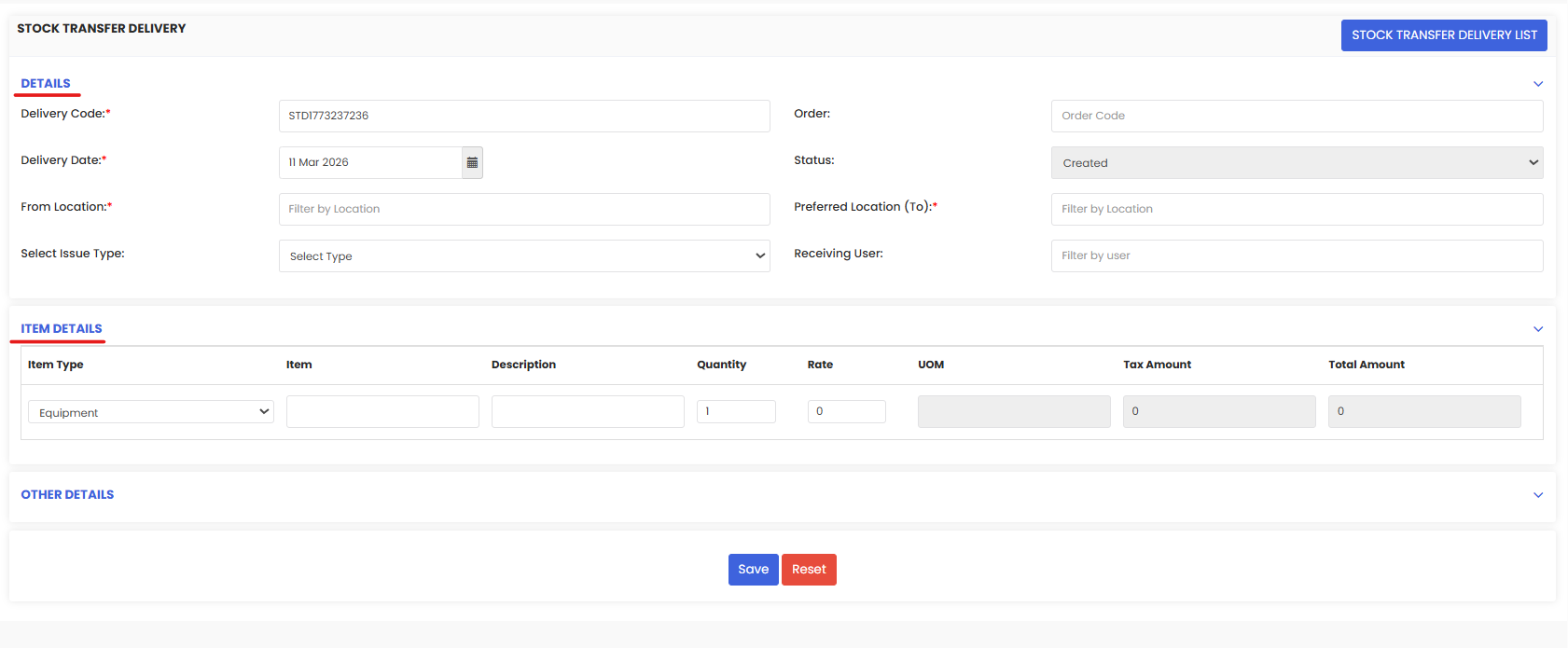 The Item Details section allows users to define the items included in the stock transfer delivery.