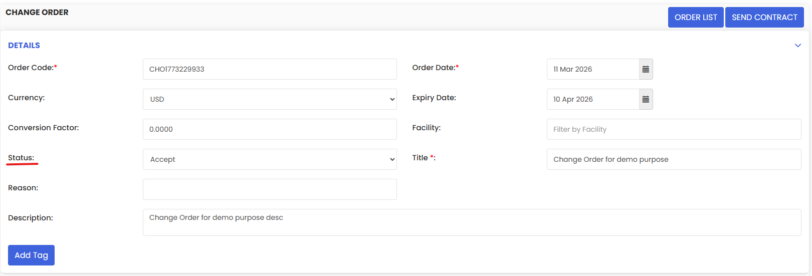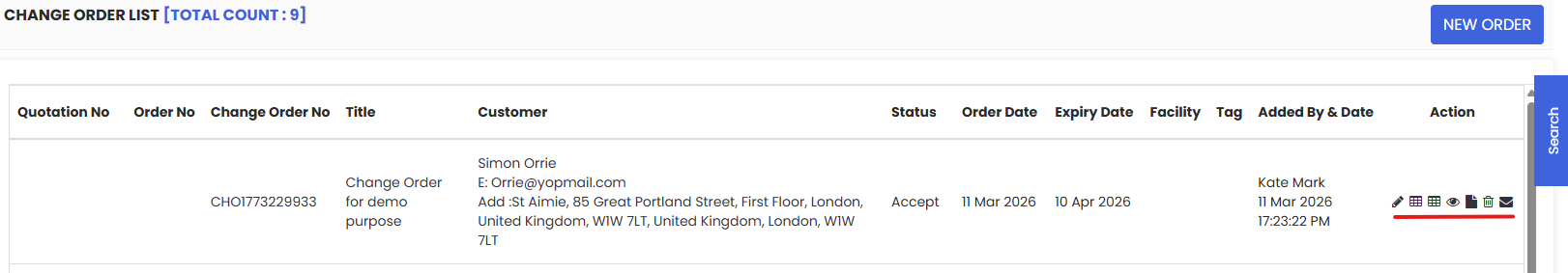 Once the status is set to Accept, the Change Order List will display the following action options for the change order: