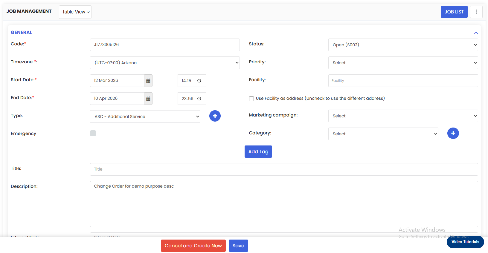 From the Change Order List, click Convert to Job. The job creation screen will open with the customer information and address already pre-filled from the change order. Enter a Title for the job, review all pre-filled details, and click Save to create the job.