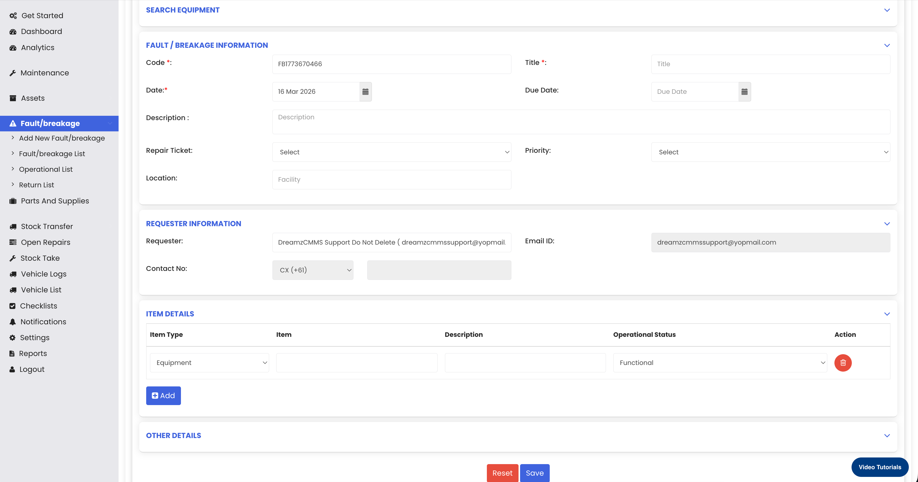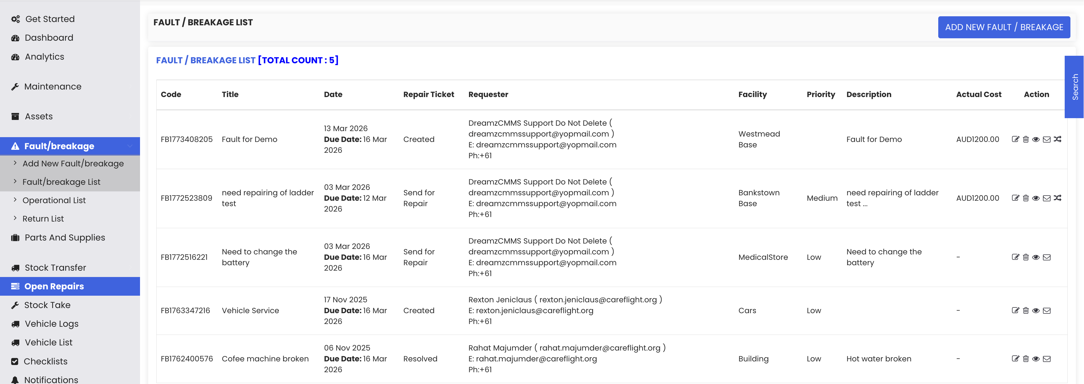In DreamzCMMS, the Fault or Breakage feature allows users to report equipment issues, assign service tasks, and track the repair process until the equipment becomes operational again. This functionality helps maintenance teams quickly identify problems, assign the appropriate personnel, and monitor the repair lifecycle efficiently.