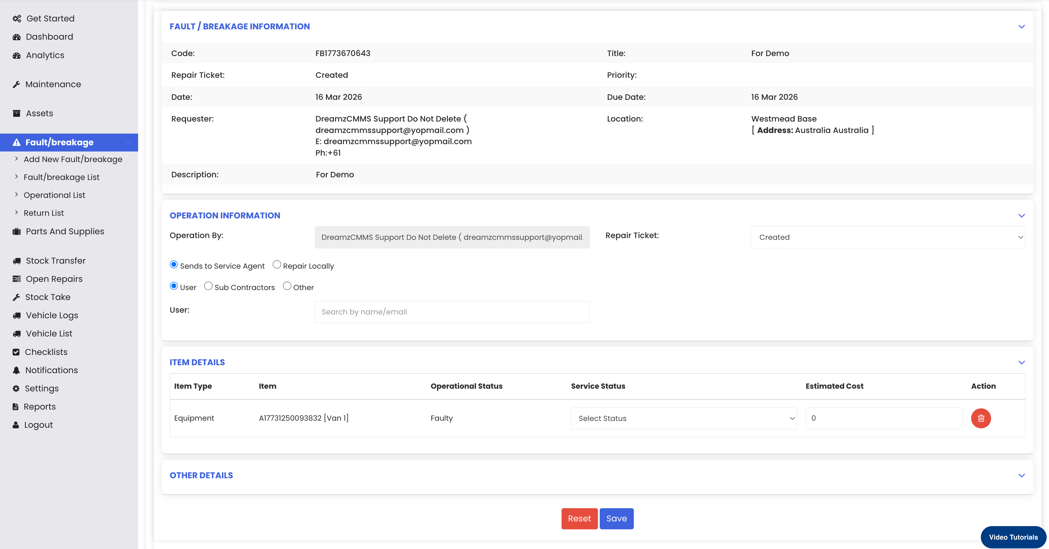 A Fault or Breakage record helps report equipment issues and track the entire repair process, including service assignment, repair status, and cost details.
