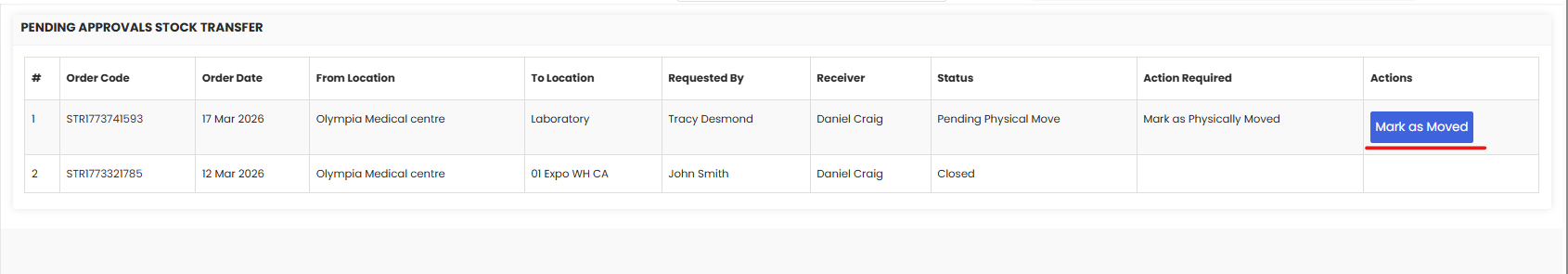 The user who created the stock transfer request is responsible for marking the stock as physically moved after approvals are completed.
