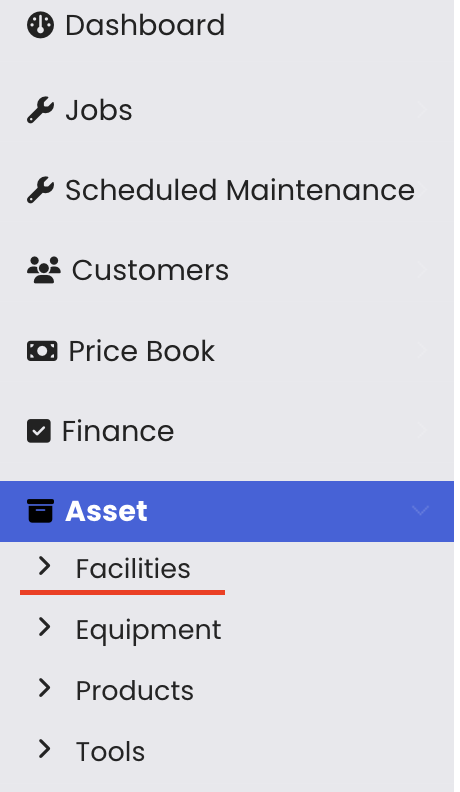 From the main menu, click Assets, then select Facilities. The Facility listing page will open.