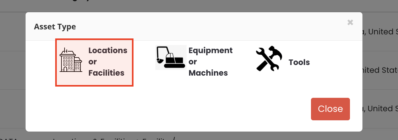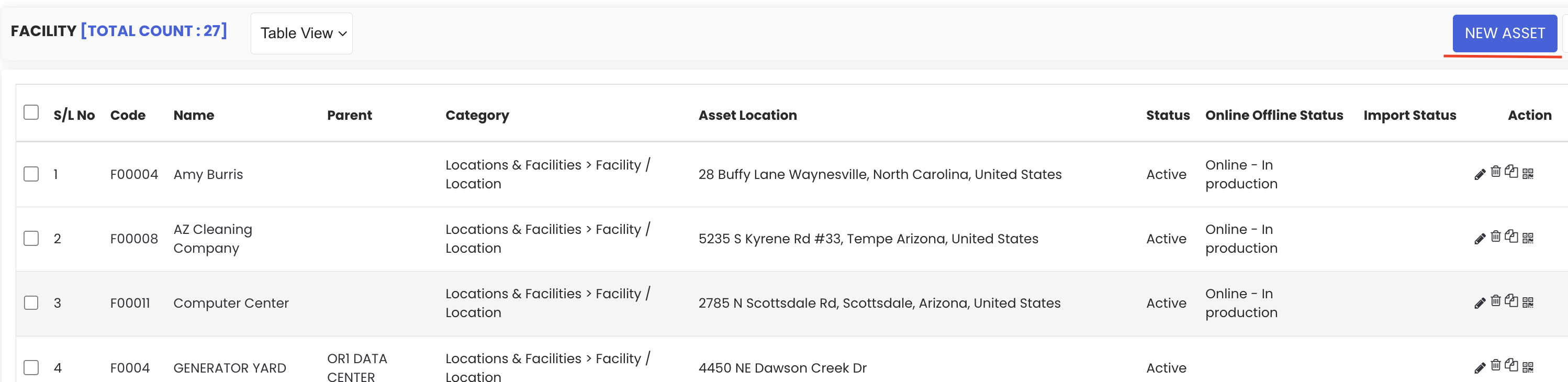 Click New Asset, then choose Location / Facility from the dropdown. This will open the location creation form.