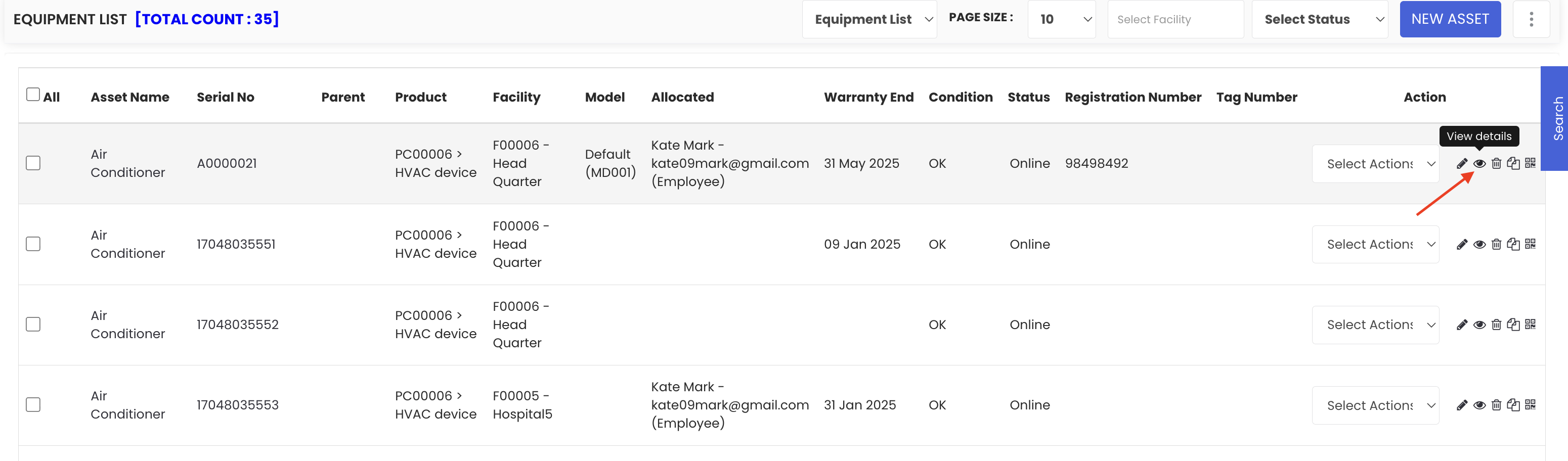 From the main menu, click Assets, then select Equipment. On the Equipment Listing page, click on an equipment item or select View Details to open its Equipment Details page.