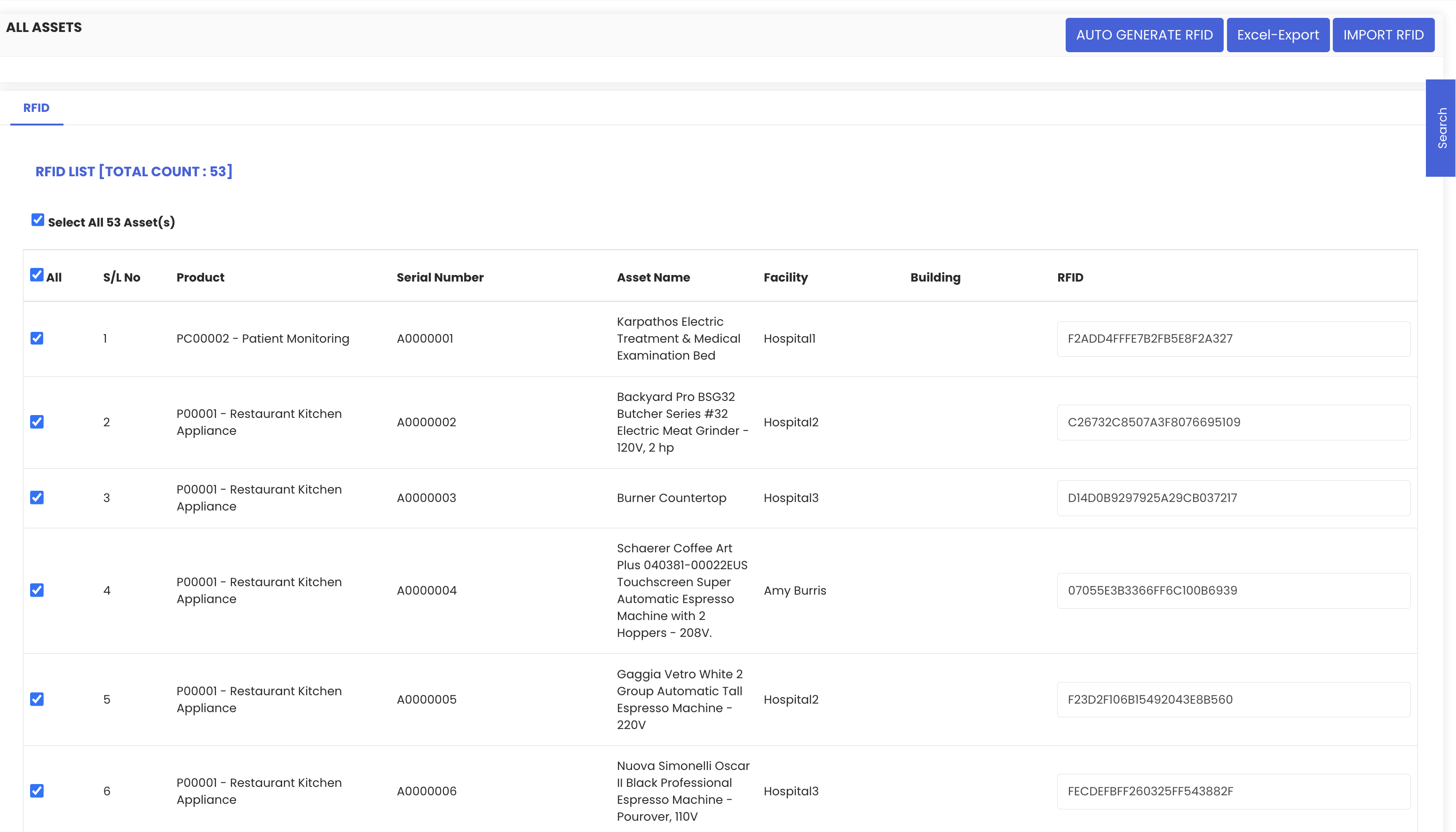 Yes. On the RFID management page, you can select all assets and click Auto-Generate RFID to assign codes to your entire asset base in one operation.