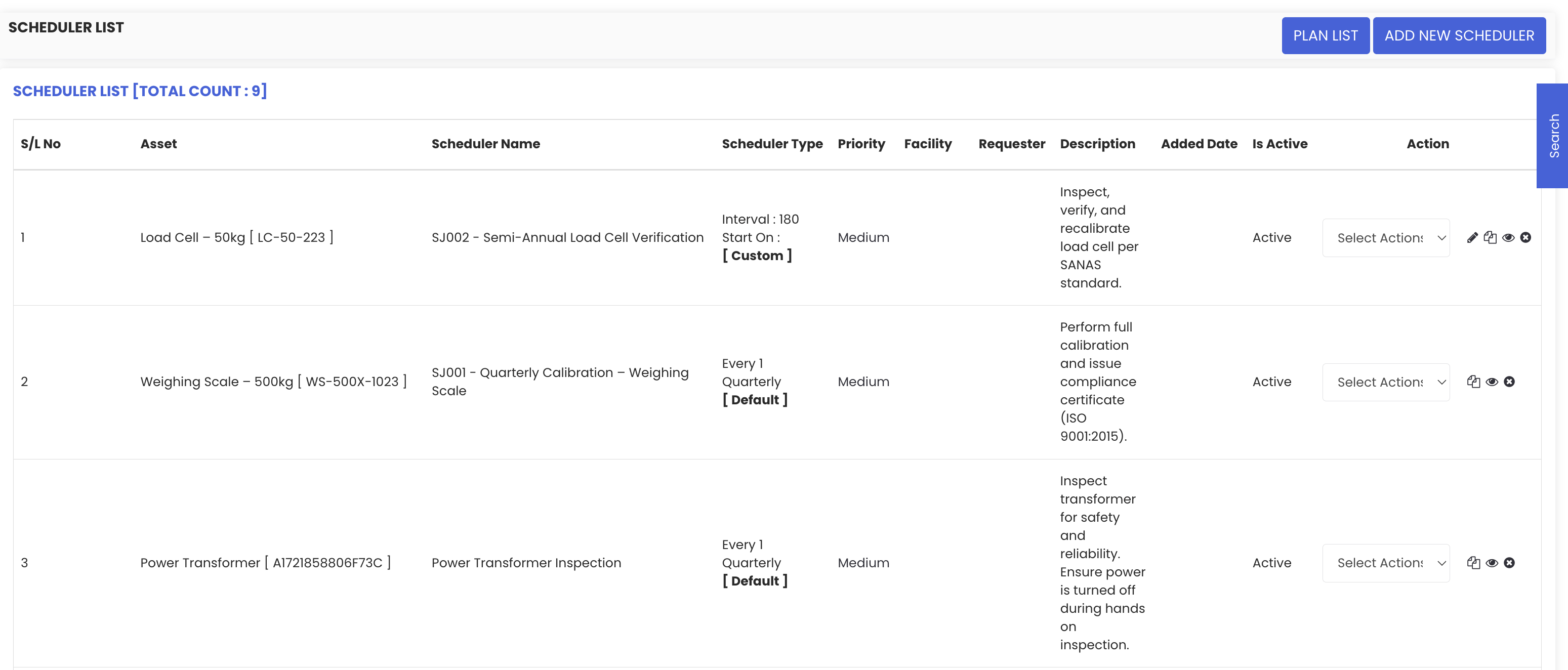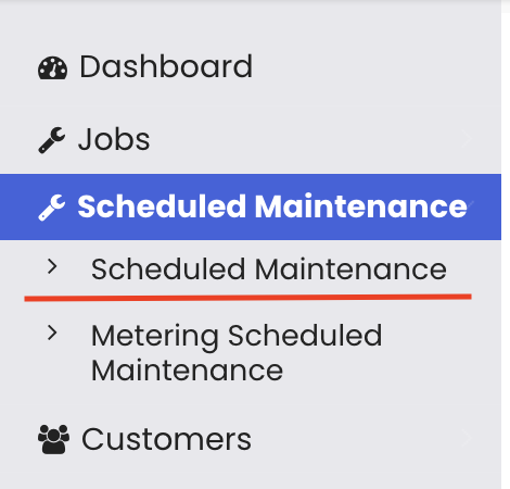 Scheduled Maintenance is managed from the Scheduled Maintenance section in the left-hand navigation menu. Each scheduler defines how often maintenance should occur, which assets are involved, who is responsible, and what tasks need to be completed. Schedulers can be set to create plans (visible in the Plan List) or to generate jobs directly. Default schedulers follow predefined system rules, while custom schedulers give you full control over interval and trigger logic.