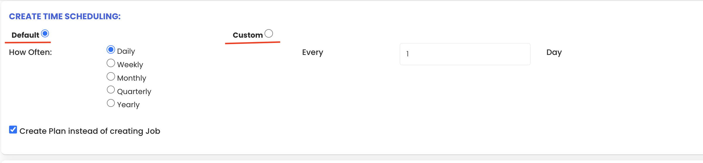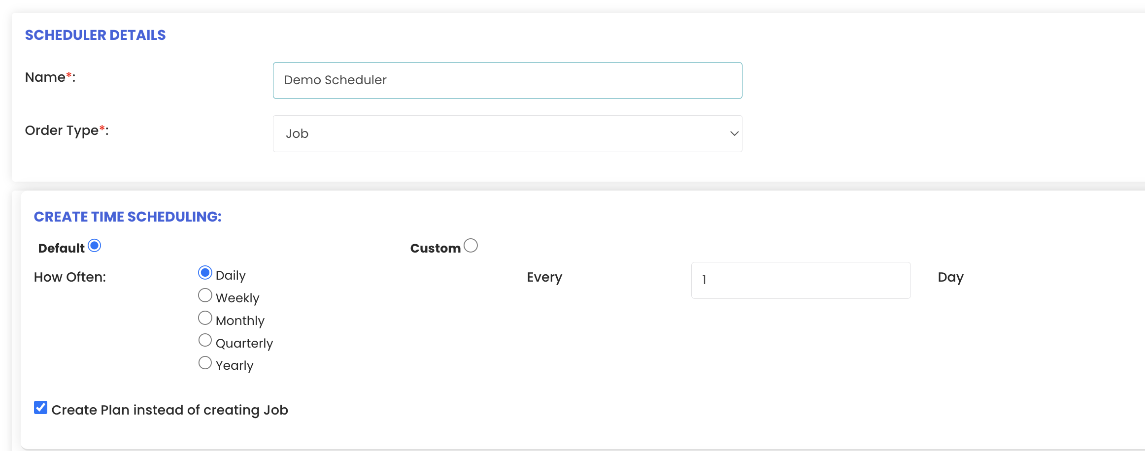 Default schedules follow predefined frequency rules such as daily, weekly, monthly, or yearly. Custom schedules allow you to define a specific interval and configure exactly when the first job is created and when subsequent jobs are triggered relative to the previous job's completion.