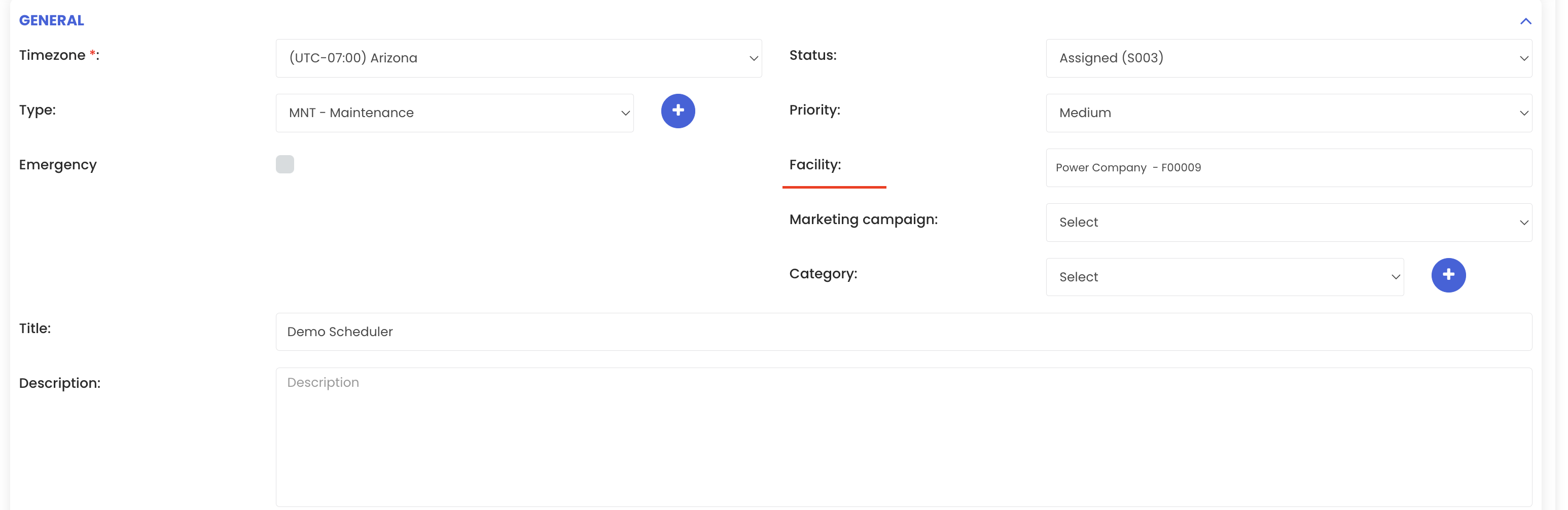 Select the location for the scheduled maintenance. The title field will be prefilled automatically. Add a description if needed, then go to the Requested Details section and choose the relevant customer.