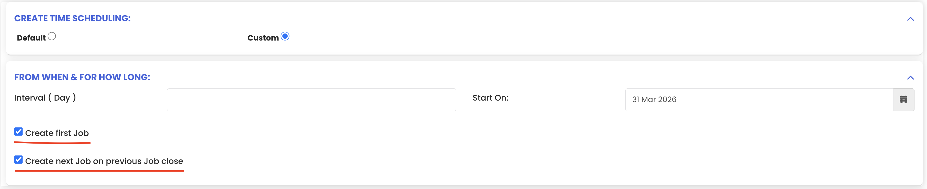 - Create First Job – If enabled, the first job is created on the selected start date itself. If disabled, the first job is created after the defined interval has elapsed from the start date.