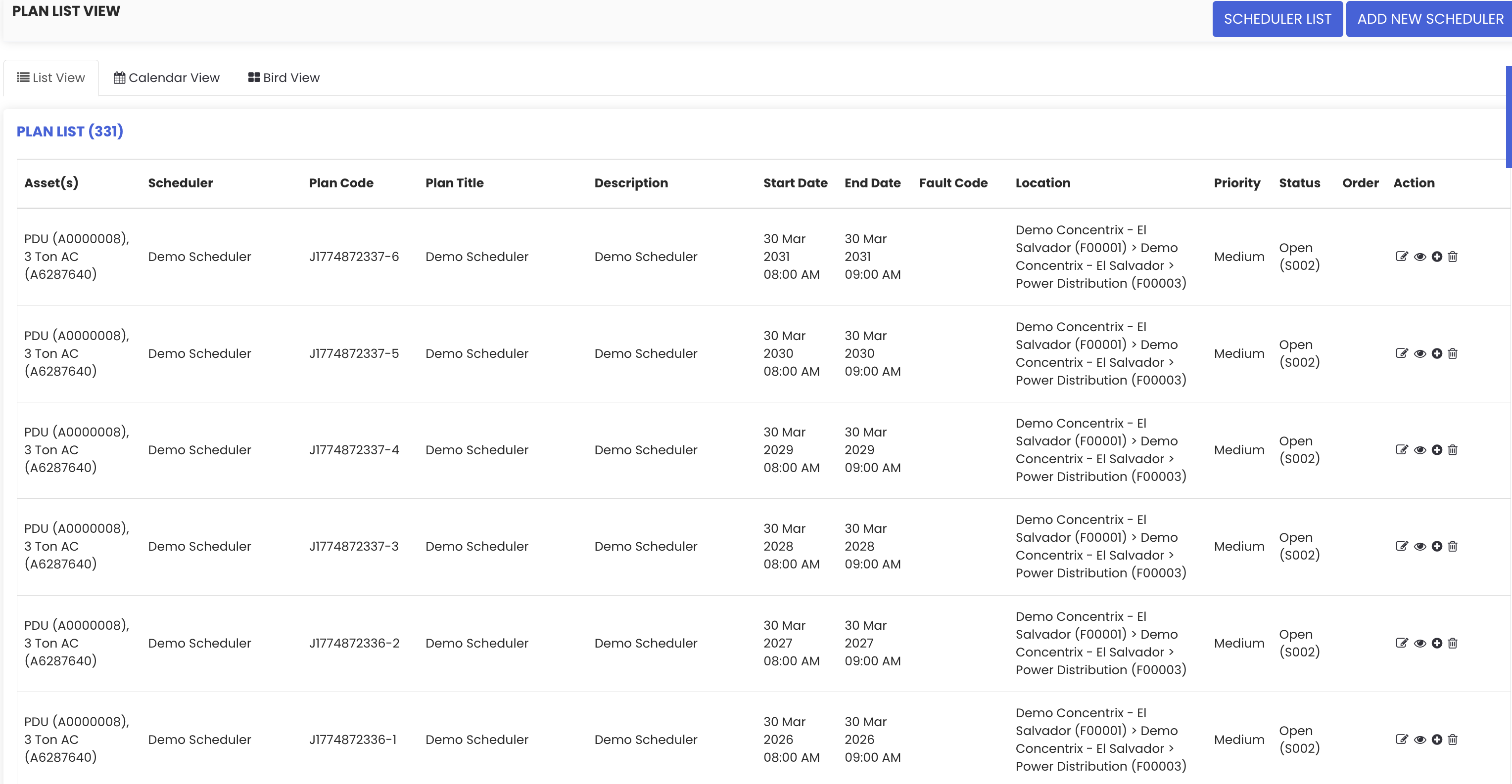 - Use the Bird View in the Plan List for a quick overview of all upcoming plans and to bulk-generate work orders when ready.