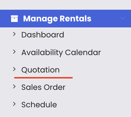 Click on Manage Rentals from the left-hand menu, then select Quotation. This opens the quotation listing page where all existing quotations are displayed.