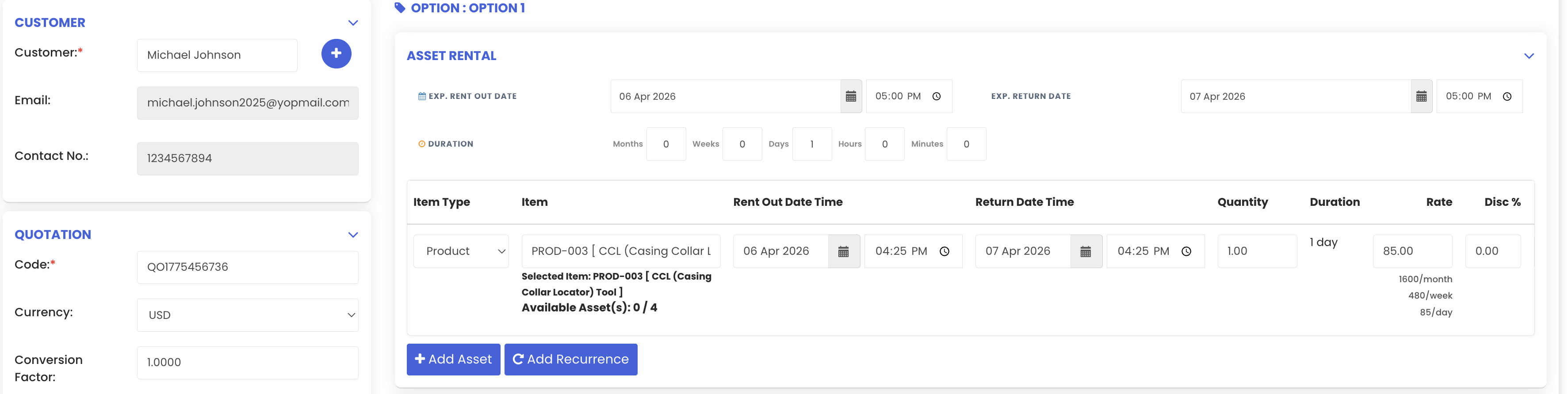 In the new quotation form, begin by selecting a customer. Then choose the expected rent-out date and time, followed by the expected return date and return time. Once these are entered, the system will automatically calculate and display the rental duration.