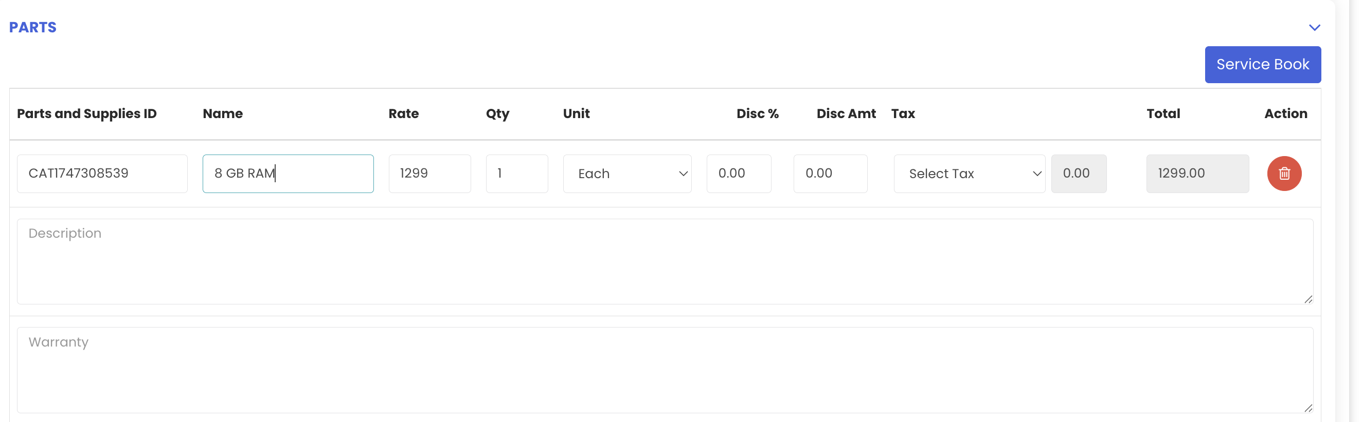 If required, you can add parts to the quotation. Select the part, apply a discount (e.g. 2%) and tax (e.g. 12%), and the total for the parts will be automatically calculated based on the rate, discount, and tax percentage.