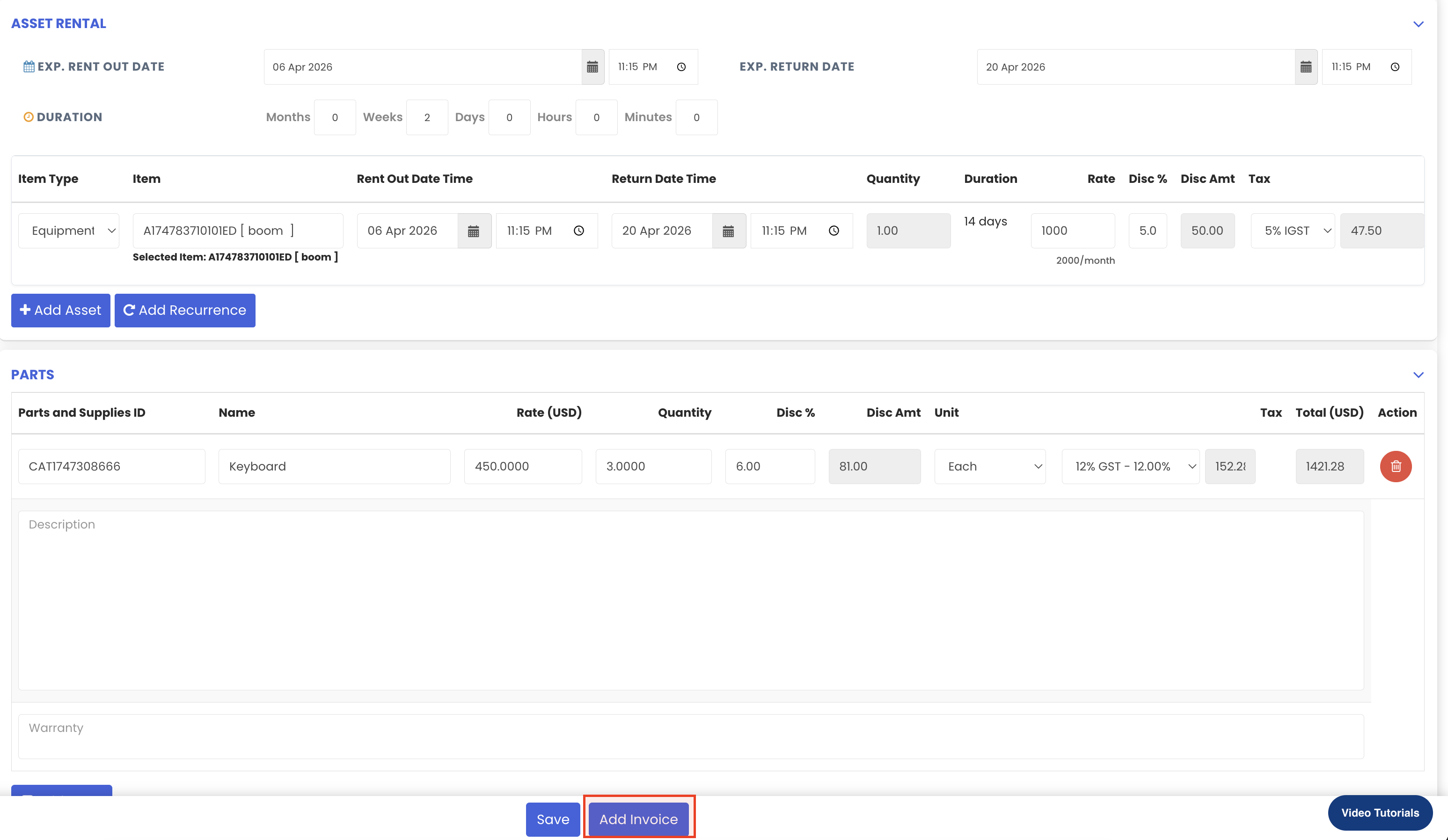 Open the saved Sales Order in Manage Rentals and click "Add Invoice." All details from the Sales Order will be pre-filled automatically. Review the details and click "Save" to generate the invoice.