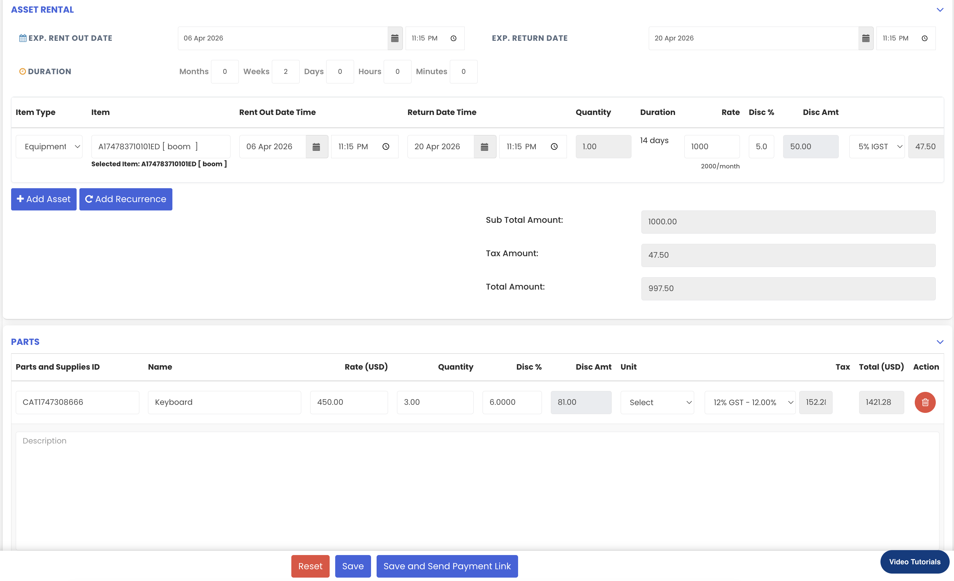 - Rental dates are reflected in the asset dashboard and equipment records