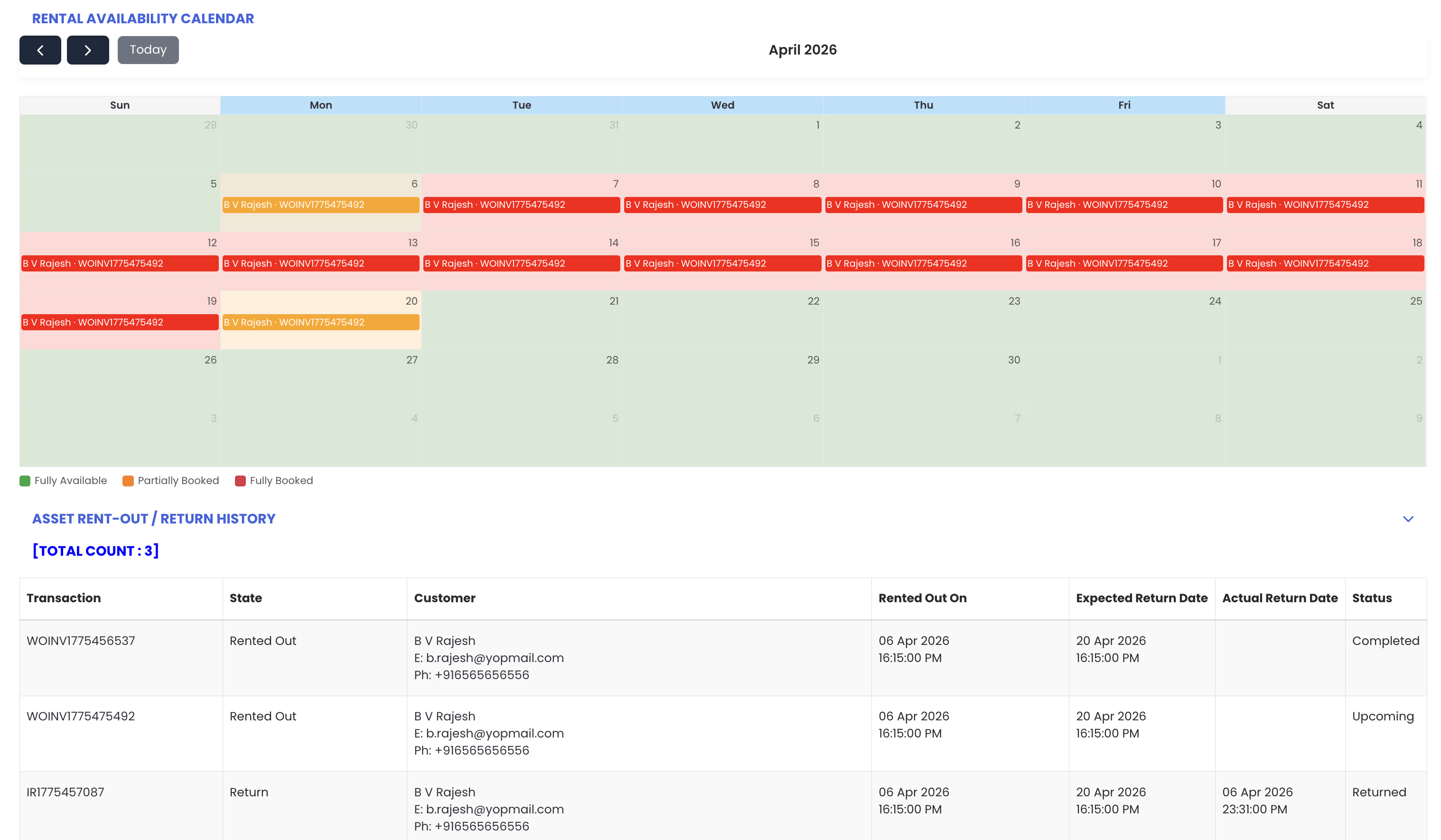The Rental Availability tab in the Equipment section displays a calendar showing the dates the asset is rented out and any partially rented dates. It also shows all transaction details linked to that asset, providing a full rental history.