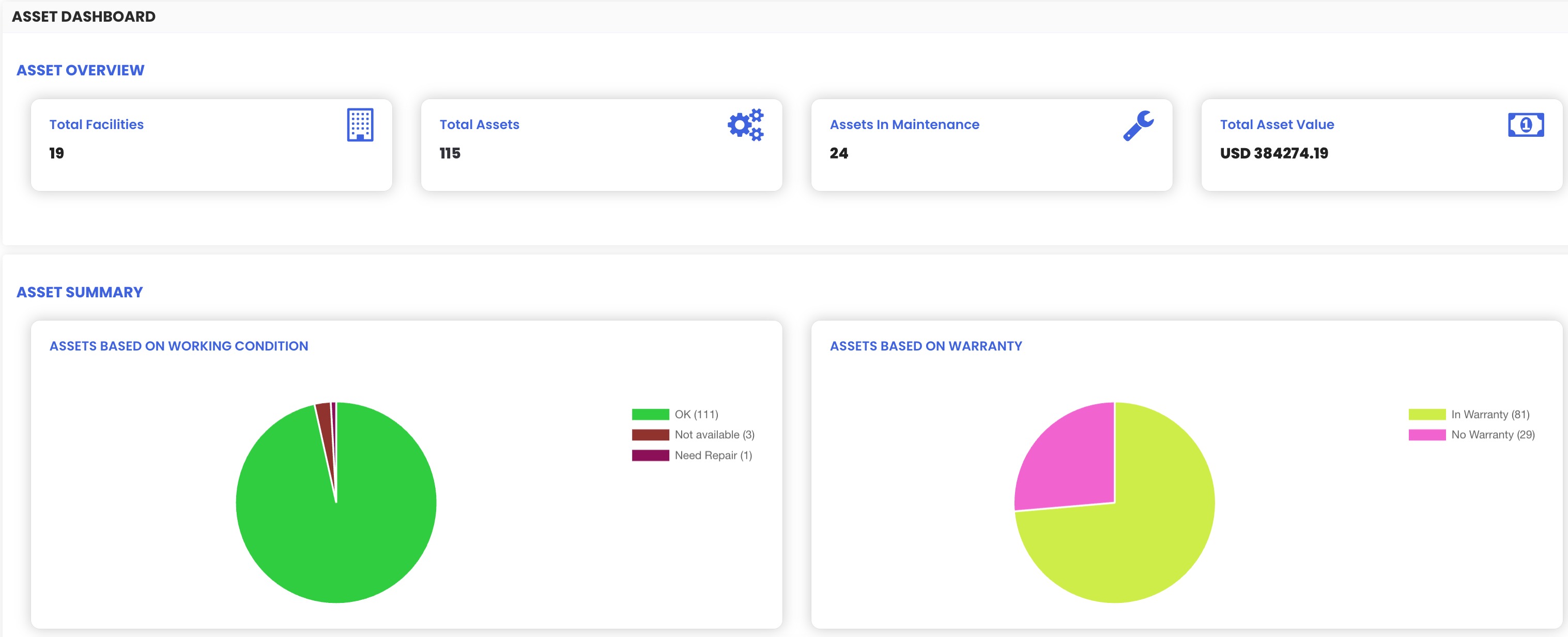 - View total facilities, total assets, assets under maintenance, and total asset value