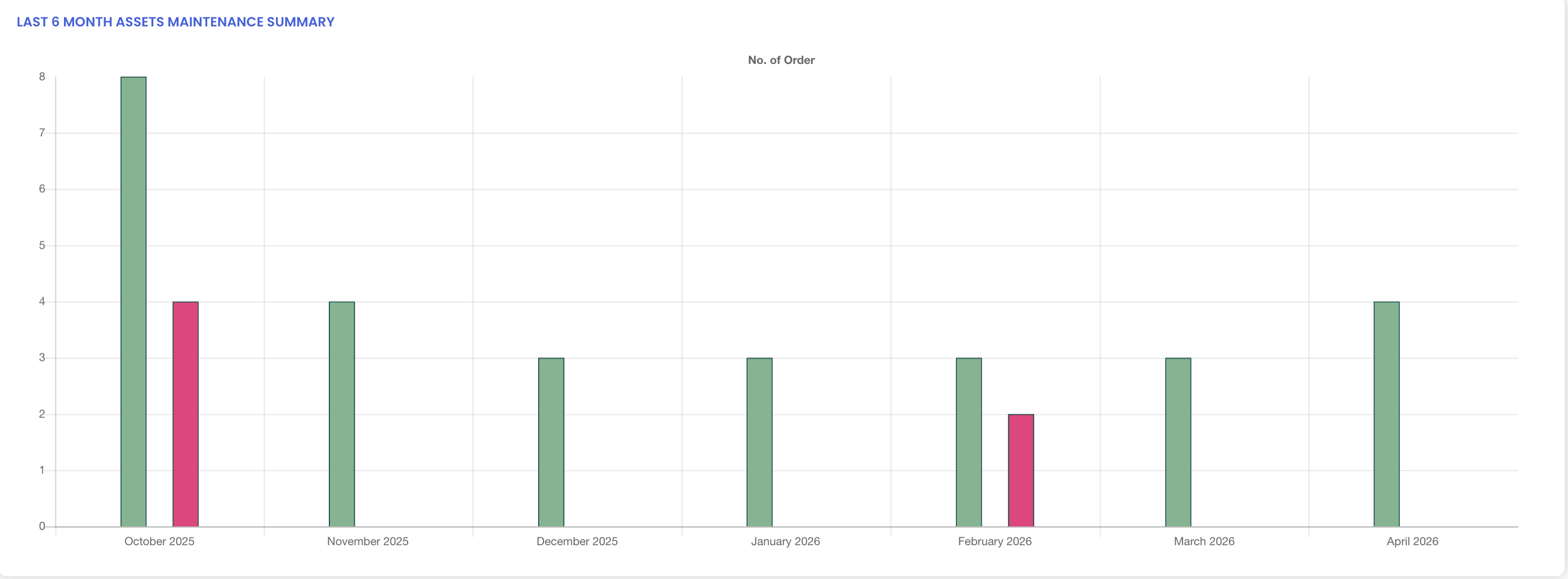 The six-month insights section shows a historical summary of how many assets have been rented out over the past six months, along with a maintenance summary for the same period. This helps managers identify trends in utilisation and maintenance activity.