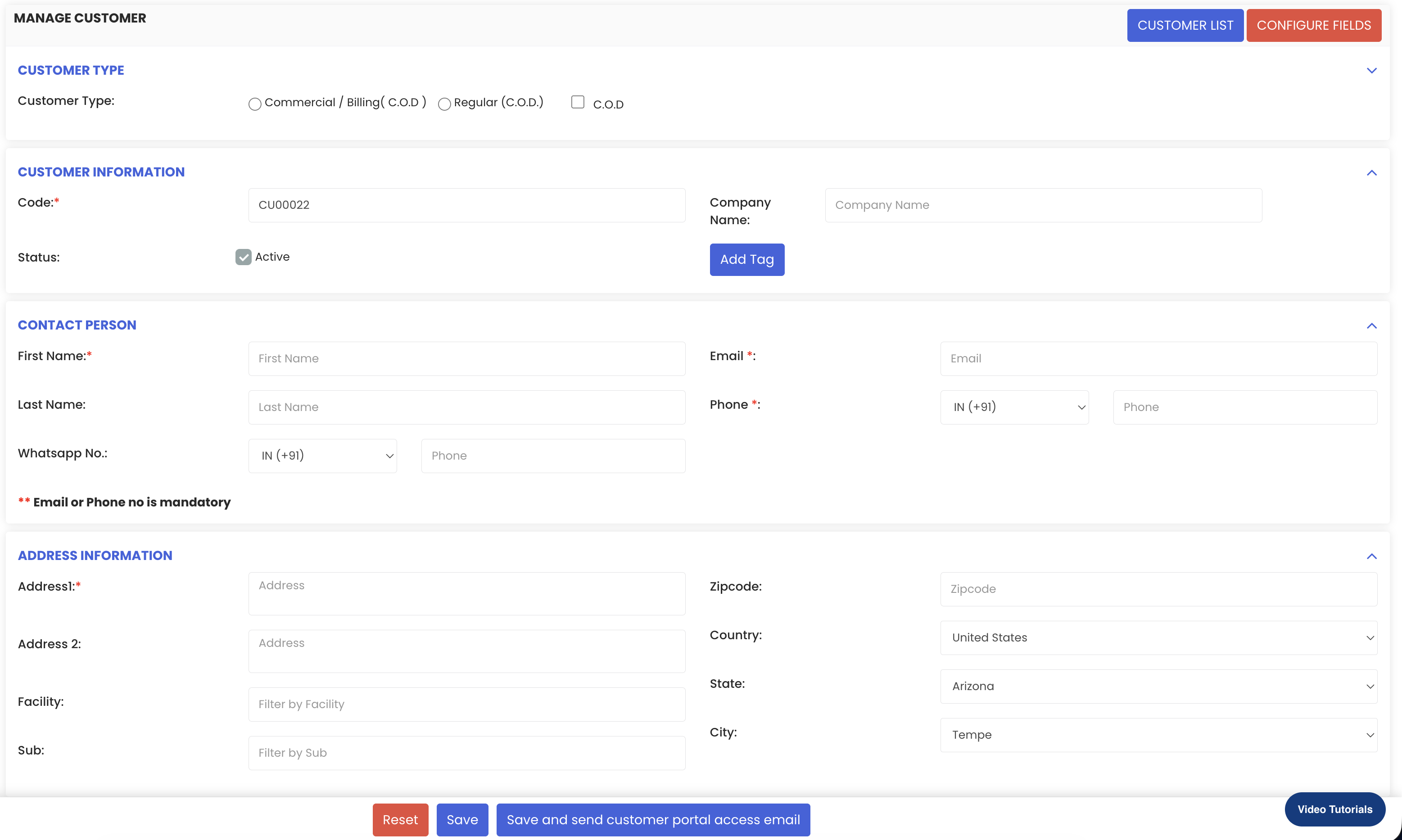 Begin by selecting the customer type. The customer code will be auto-generated by the system. Then enter the following mandatory fields: