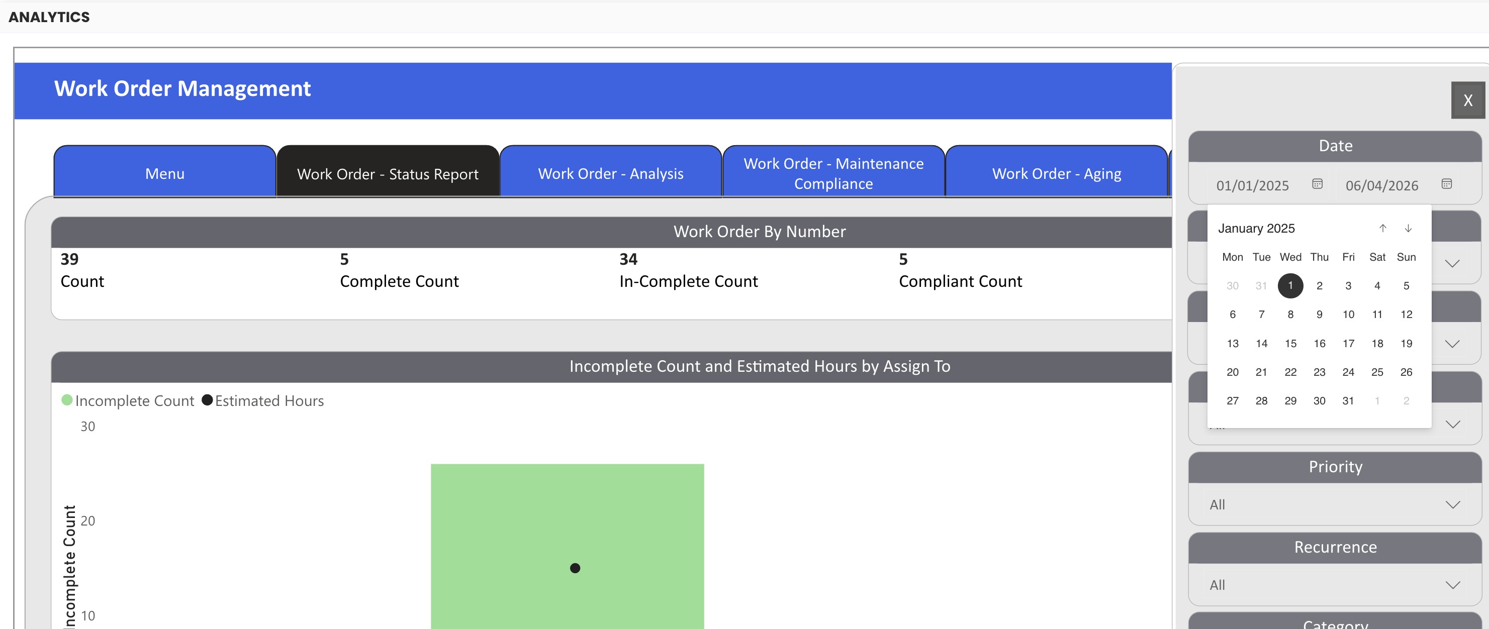 - Use the date range filter to scope your analysis to a specific period, making it easier to identify trends in work order volumes and completion rates over time.
