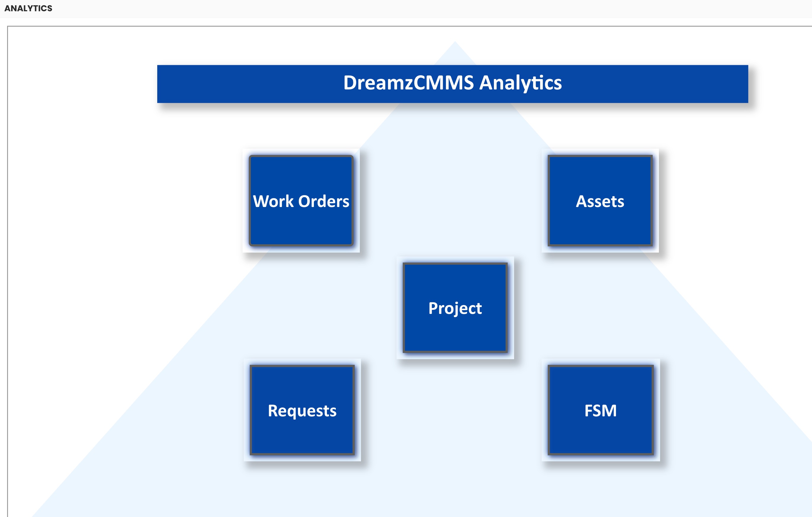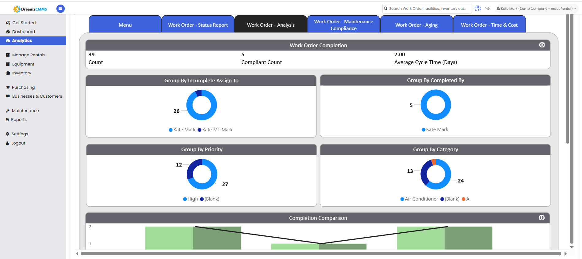 The Work Orders Analytics section in DreamzCMMS provides a comprehensive view of all work orders through interactive charts and configurable filters. Users can navigate to the Work Orders section within the analytics dashboard, apply date range and status filters, check priority levels, review work orders by assigned users, track completion status, monitor maintenance compliance, and analyse work orders by age. This feature helps managers and teams stay informed on work order volumes, statuses, and performance across their operations.