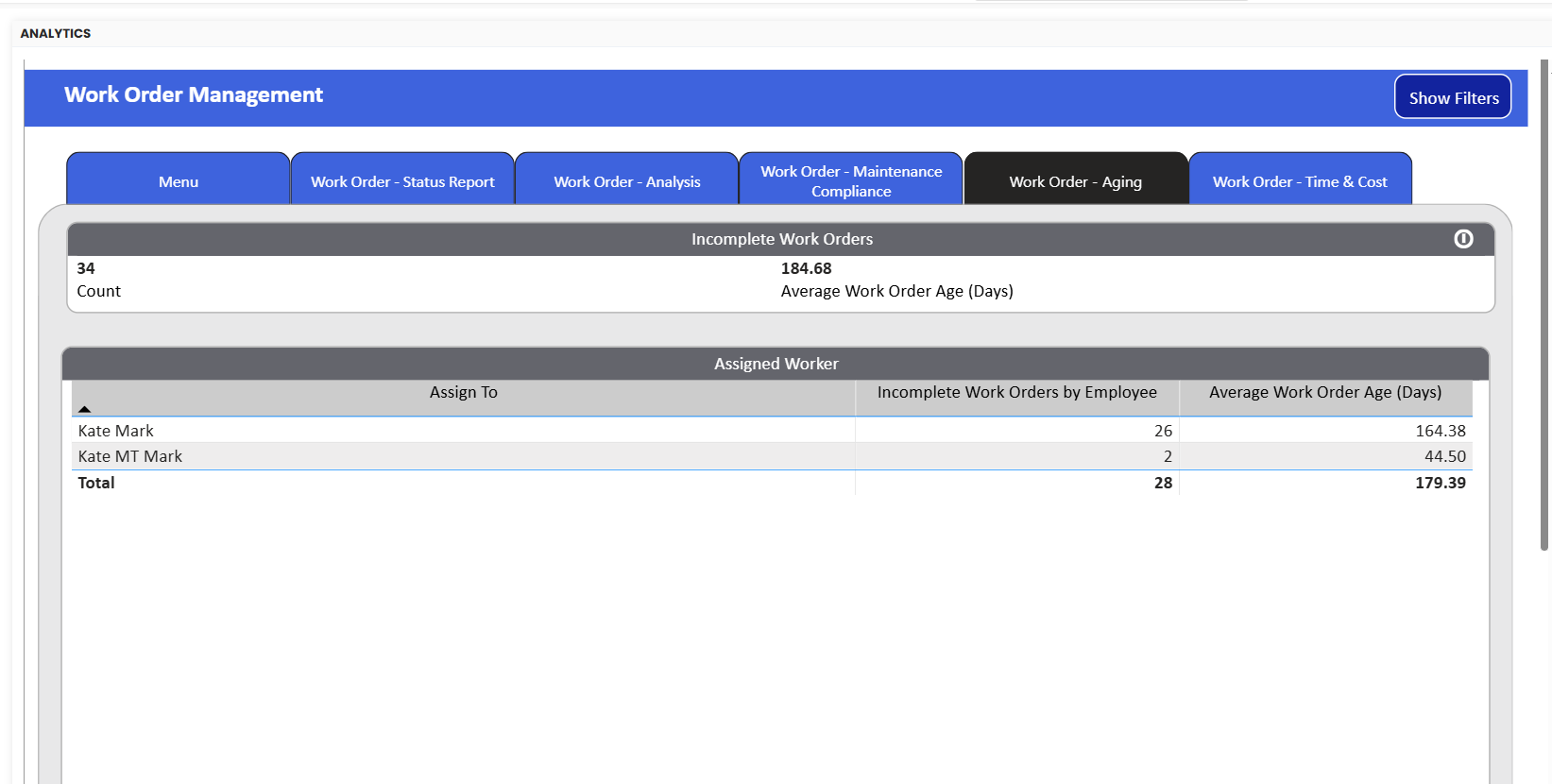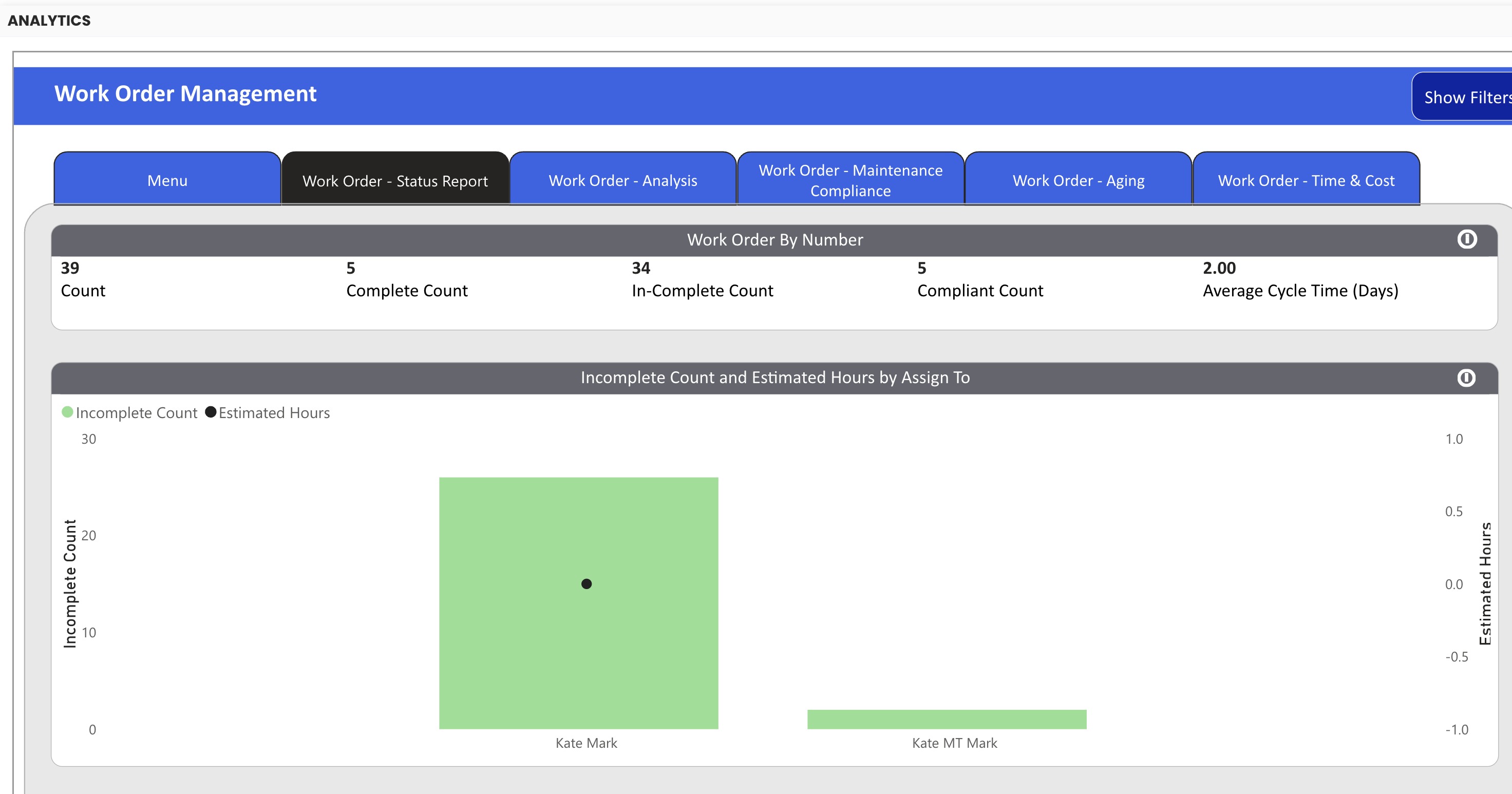- Apply the user filter to evaluate individual technician performance and ensure work orders are being distributed and completed evenly across your team.