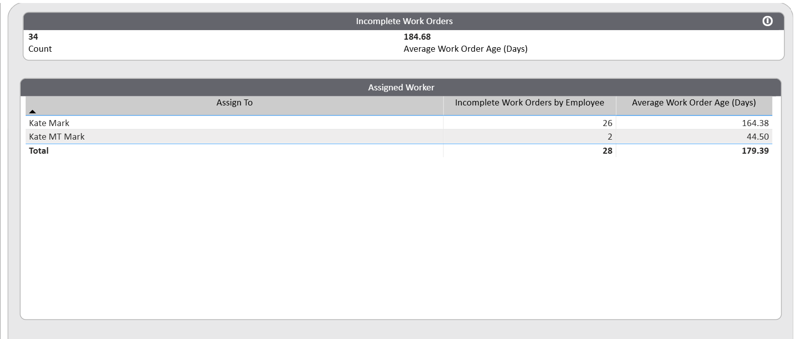 The Work Orders by Age section displays how long each open work order has been active. This helps managers identify overdue or long-standing work orders that require immediate attention or follow-up.