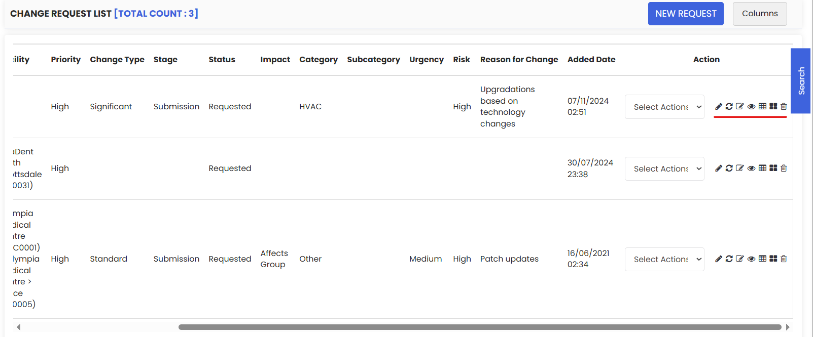 Click Save and the change request will be added to the listing. The listing includes several action buttons: Edit, Update Status, Add Note, View, Convert to Work Order, Add Purchase Request, and Delete.