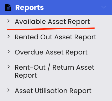 Click on "Reports" from the left-hand side menu in the Asset Rentals module and select "Available Asset Report" from the list of available reports.