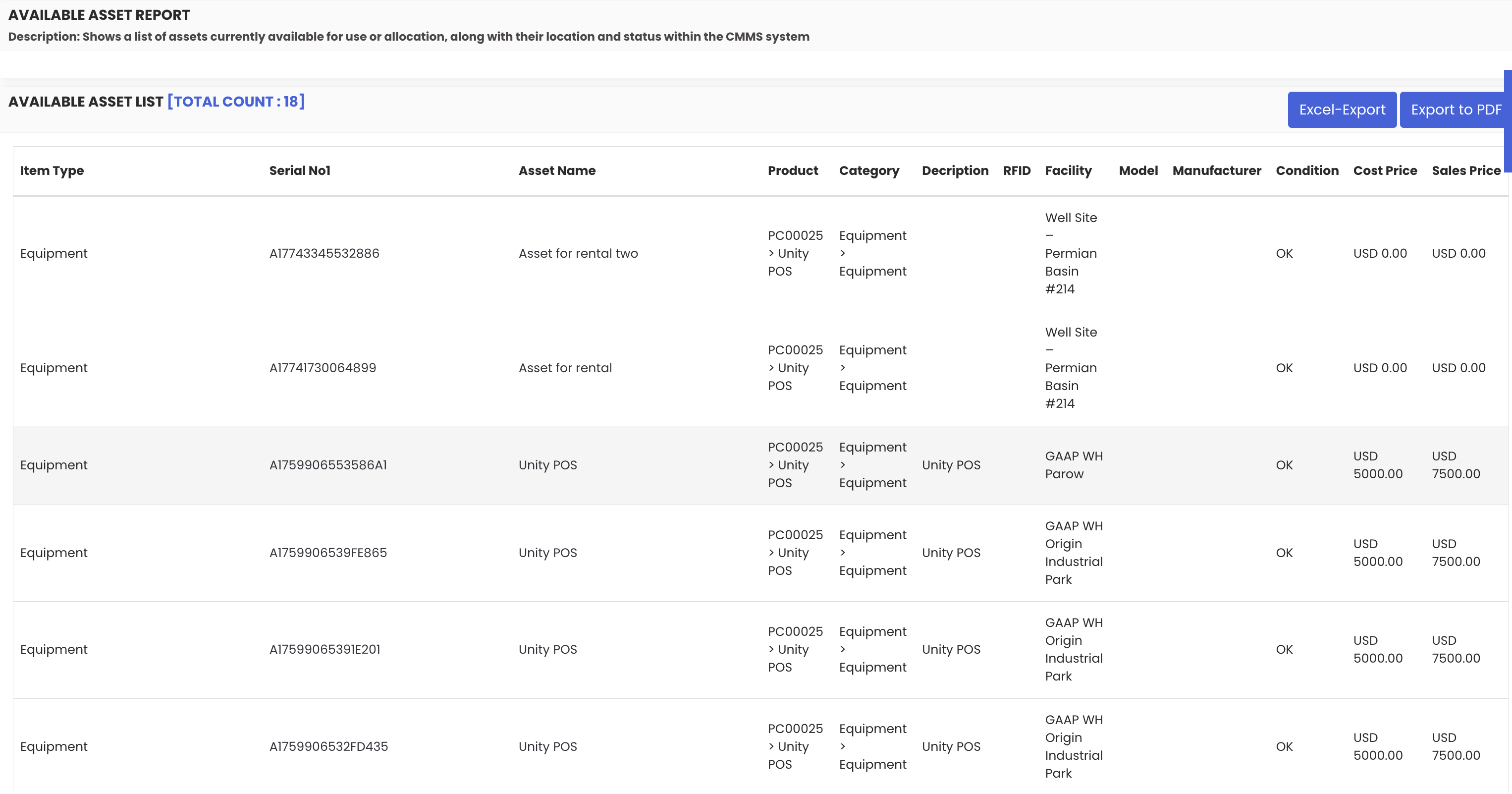 The Available Asset Report is accessible from the Reports menu within the Asset Rentals module in DreamzCMMS. It provides users with an instant view of which assets in their fleet are currently free and available for new rental bookings. This report is particularly useful for operations teams who need to quickly identify available inventory before confirming a customer booking. The report supports both Excel and PDF export options, making it easy to share or archive the data as needed.
