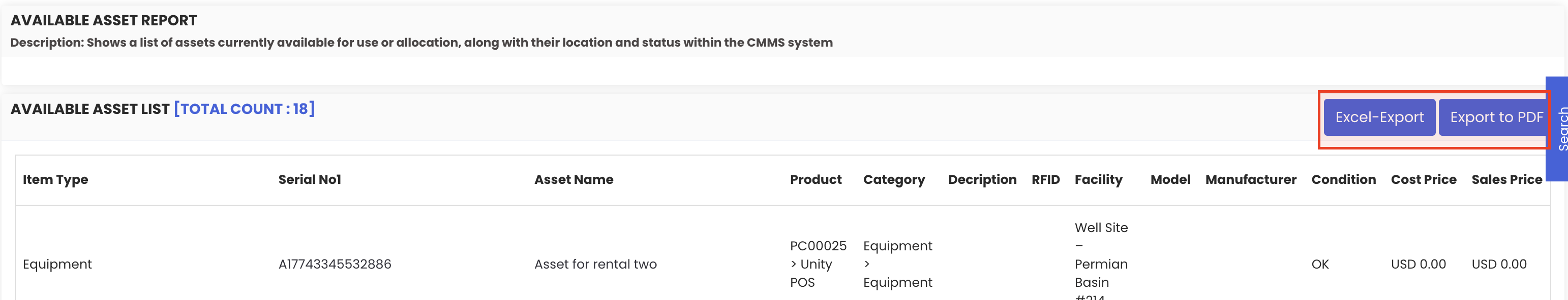 The Available Asset Report in DreamzCMMS Asset Rentals gives you a real-time overview of all assets that are currently available for rental. It is a quick and effective way to understand your fleet's availability at any given time and supports data export for further analysis or sharing. Key highlights include: