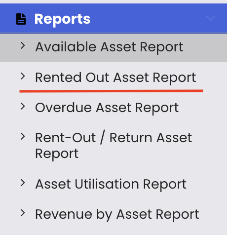 Click on "Reports" from the left-hand panel in the Asset Rentals module and select "Rented-Out Asset Report" from the list.