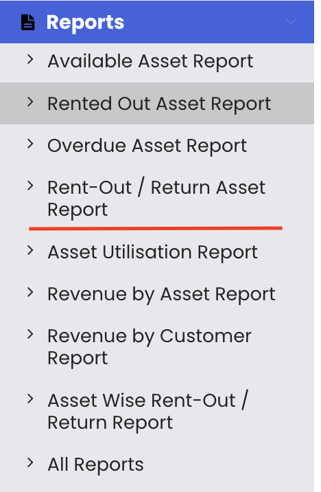 Click on "Reports" from the left-hand panel in the Asset Rentals module and select "Rent-Out Return Asset Report" from the list.
