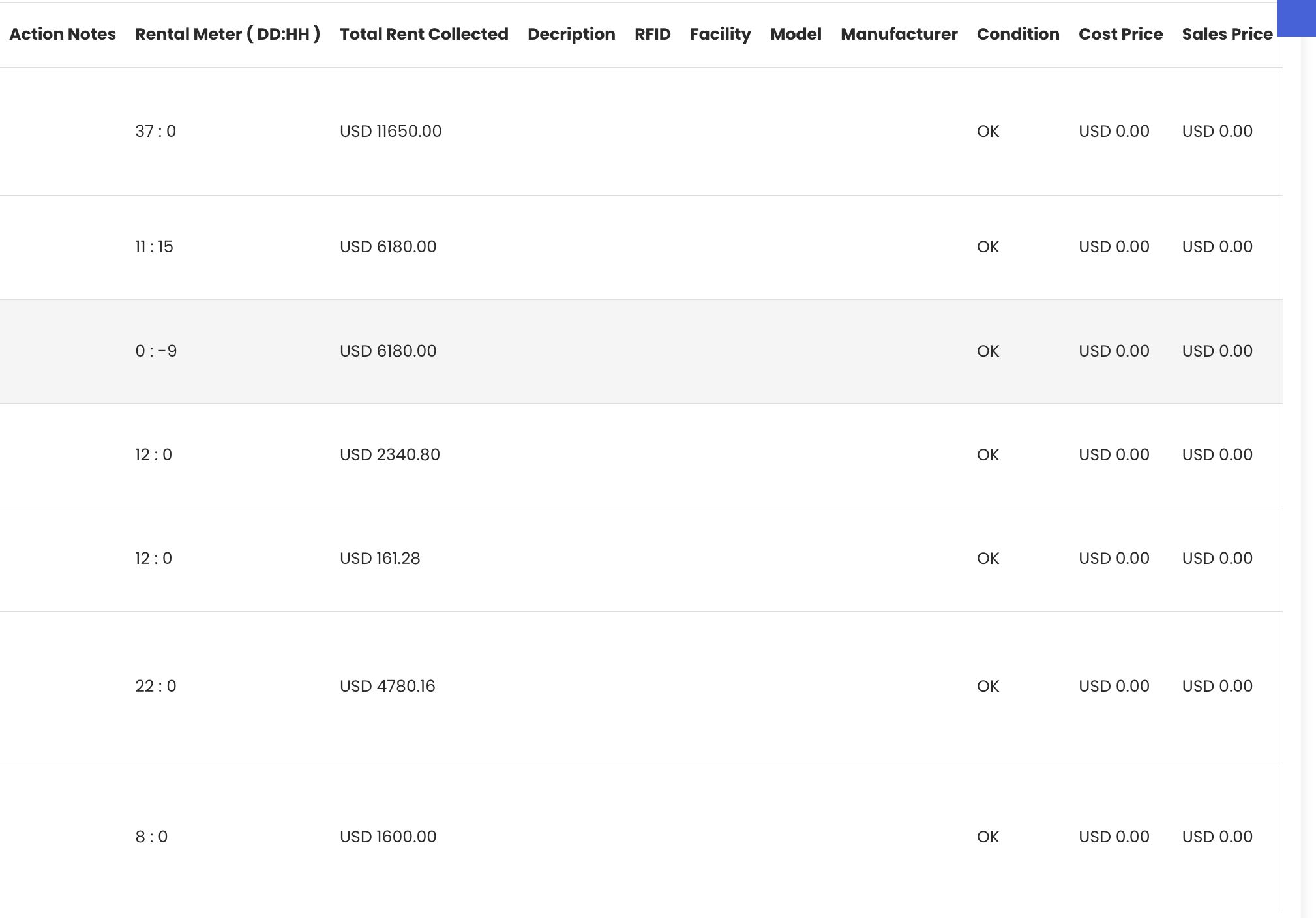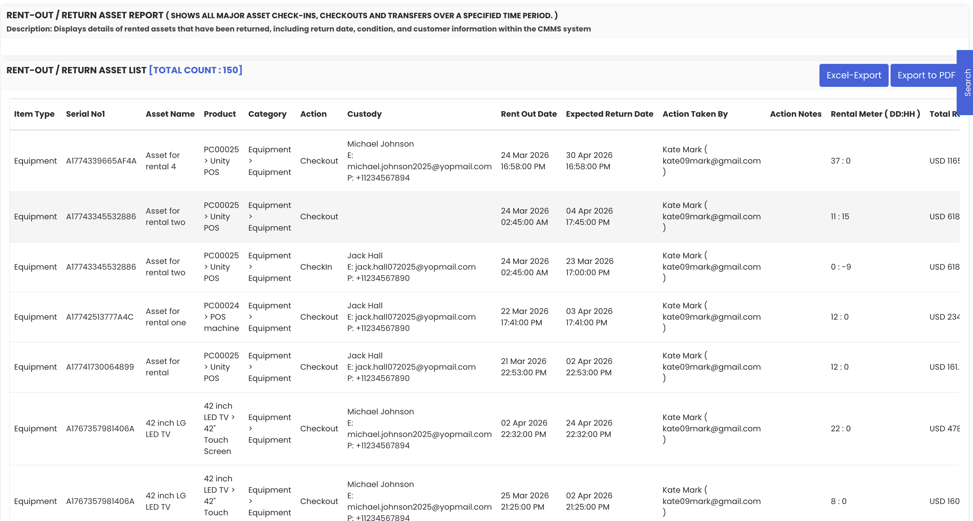 On the right-hand side of the report, the rent meter displays the total duration for which each asset was on rent, expressed in both days and hours. This is particularly useful for verifying the accuracy of billing and confirming the exact rental period for each completed transaction.