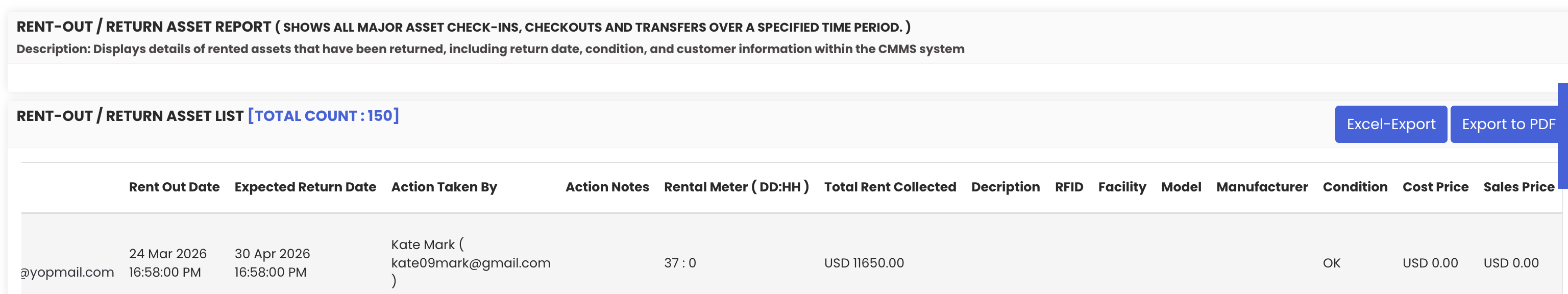 The Rented-Out Asset Report shows assets that are currently on rent. The Rent-Out Return Asset Report focuses on completed rentals — assets that have already been returned — and includes the actual return date and rent meter duration.