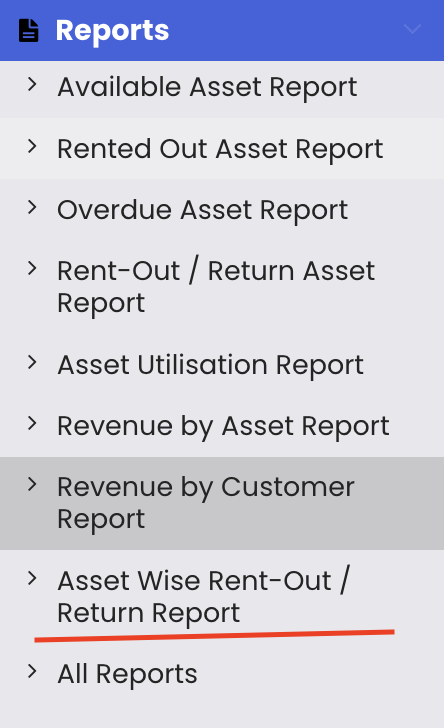 From the reports list, select "Asset-wise Rent-Out Return Report." The report will load and display detailed transaction-level data for each asset.