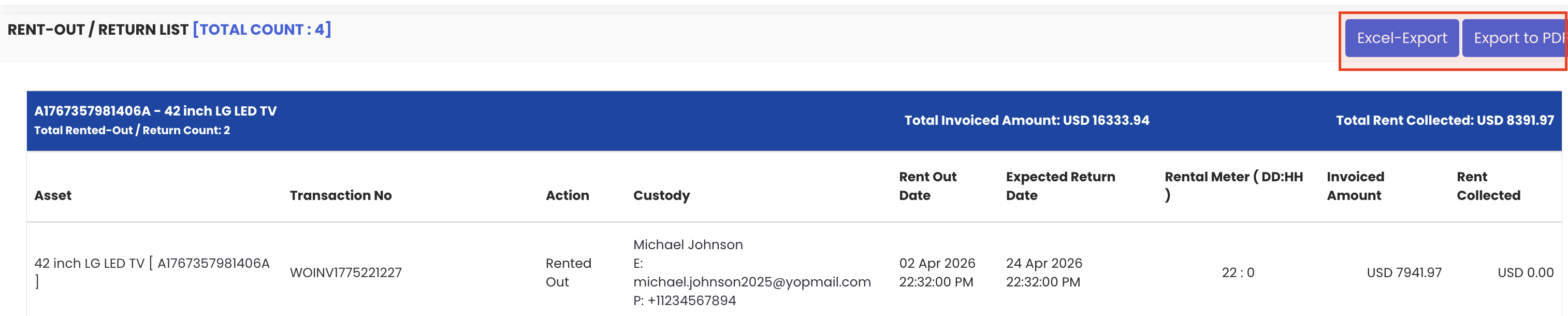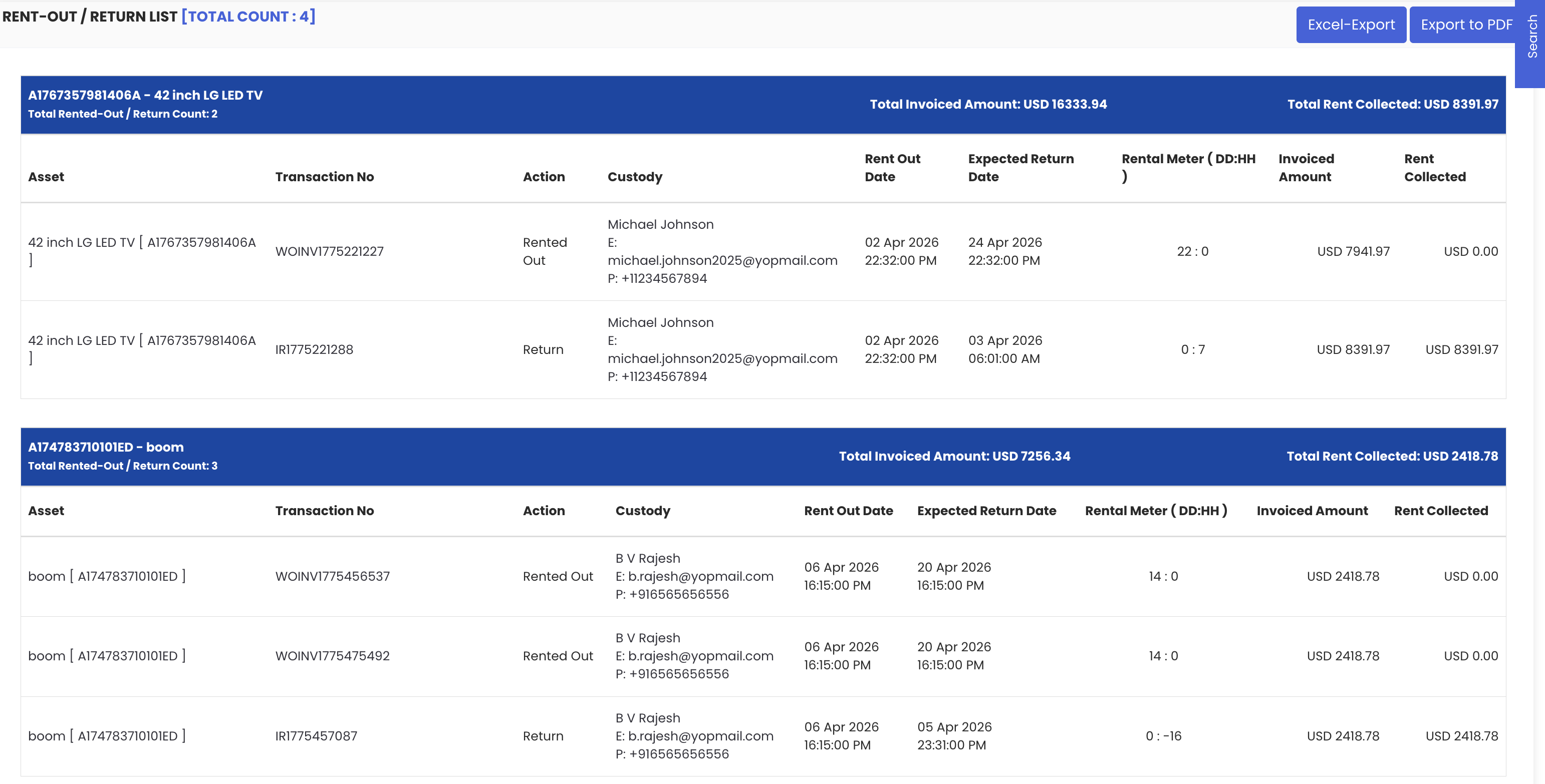 This report provides transaction-level detail for each asset, including the asset name, invoice number, customer details, status, rent-out and return dates, rental meter (days and hours), invoiced amount, and total rent collected.