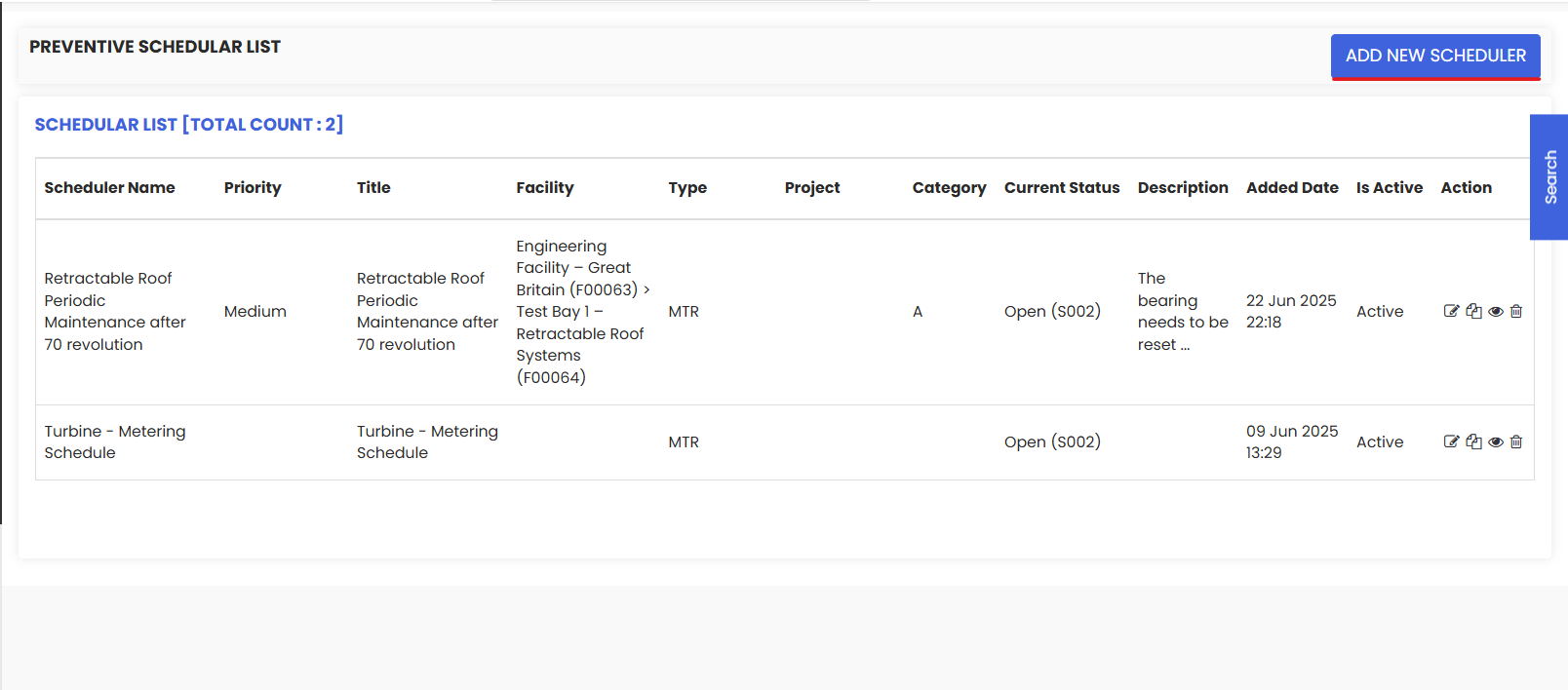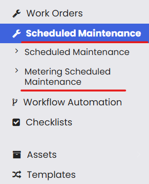 From the left-hand navigation menu, click on Scheduled Maintenance, then select Metering Scheduled Maintenance from the submenu. This will show the list of all existing metered PM schedulers.